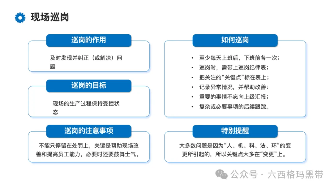 巡岗是现场管理的重要手段,通过定期巡视生产现场,及时发现并纠正问题,确保生产过程的顺利进行。