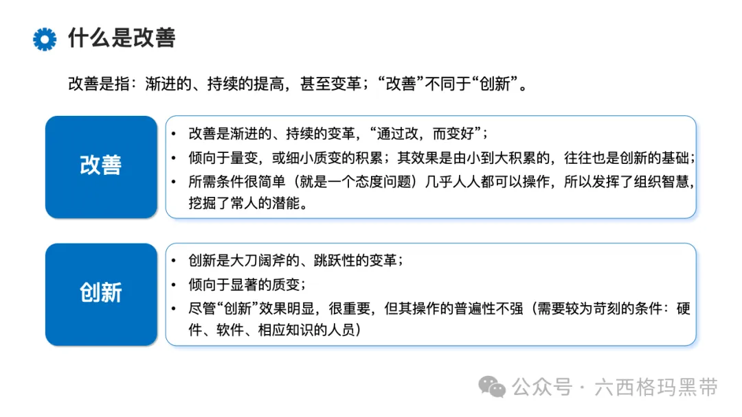 改善是指通过渐进的、持续的变革来提高生产效率和质量。与创新不同,改善更注重量变的积累,通过小的改进逐步实现大的提升。