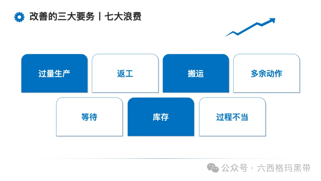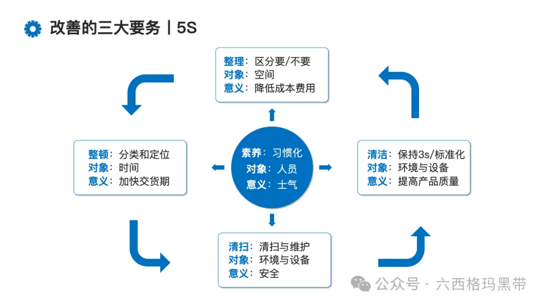 改善的三大要务包括标准化、5S和消除七大浪费。