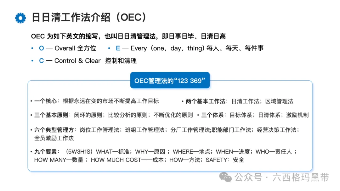 OEC管理法是一种高效的现场管理方法,其核心是日事日毕、日清日高。