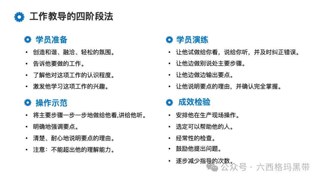 工作教导的四阶段法是一种有效的培训方法,通过四个阶段的逐步引导,帮助员工掌握工作技能。
