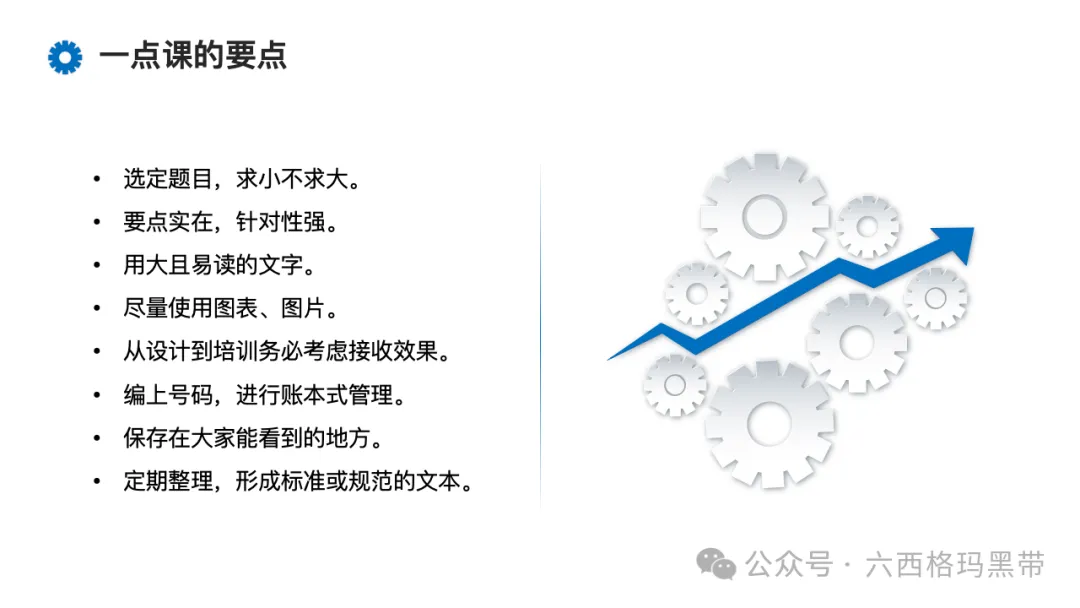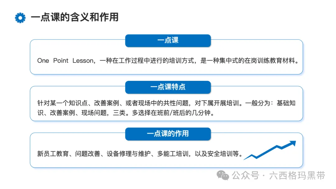 一点课(One Point Lesson)是一种在工作过程中进行的培训方式,通过简短的培训课程,帮助员工快速掌握必要的知识和技能。