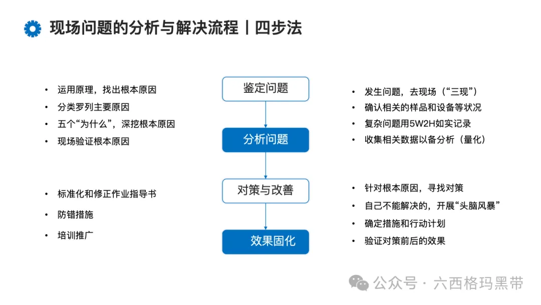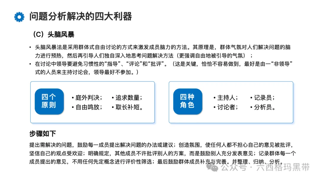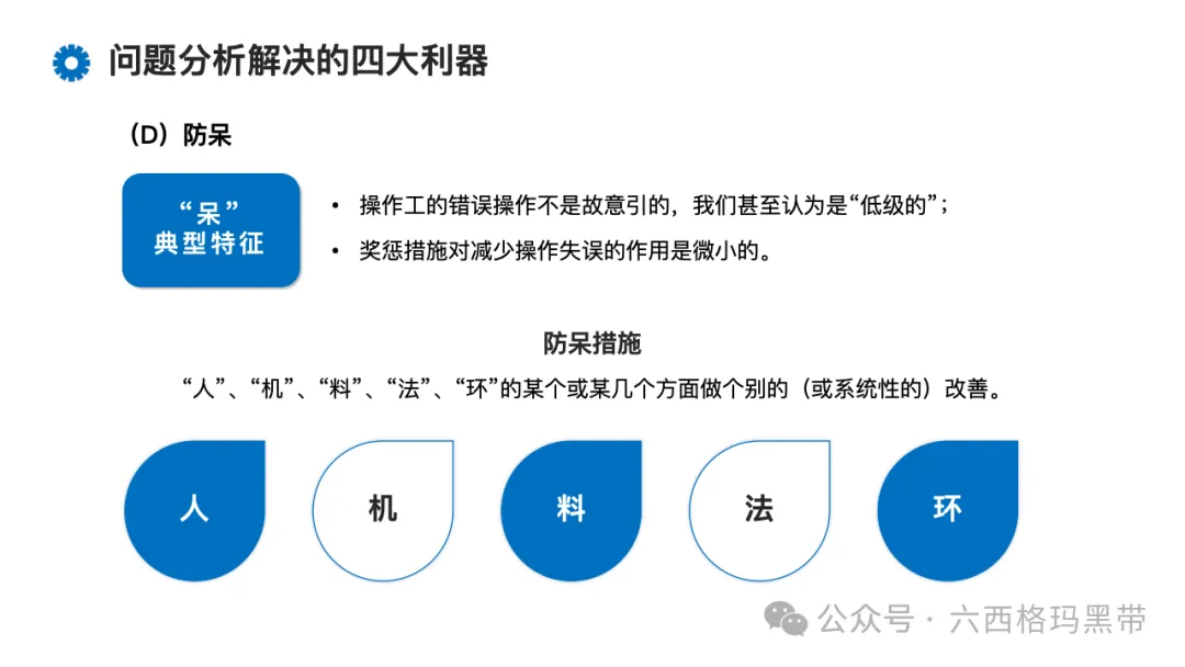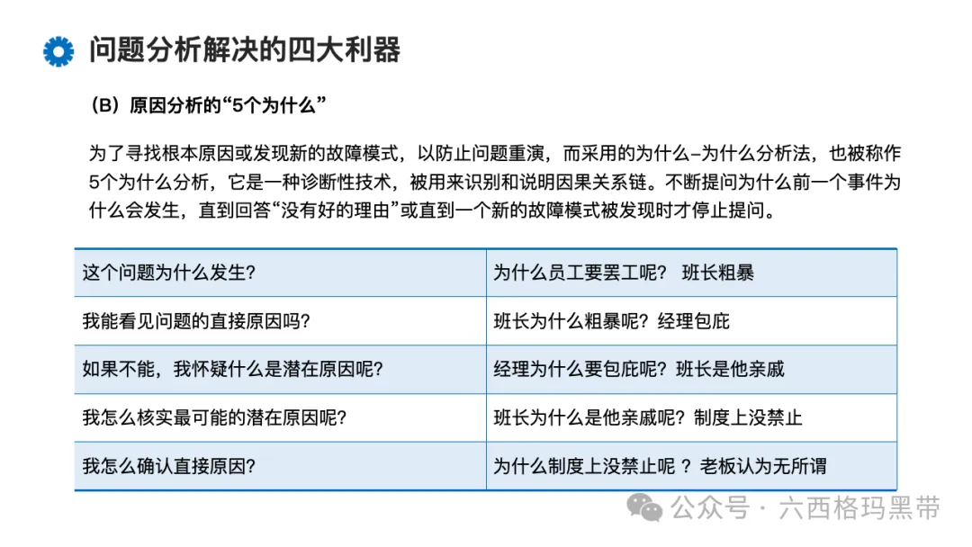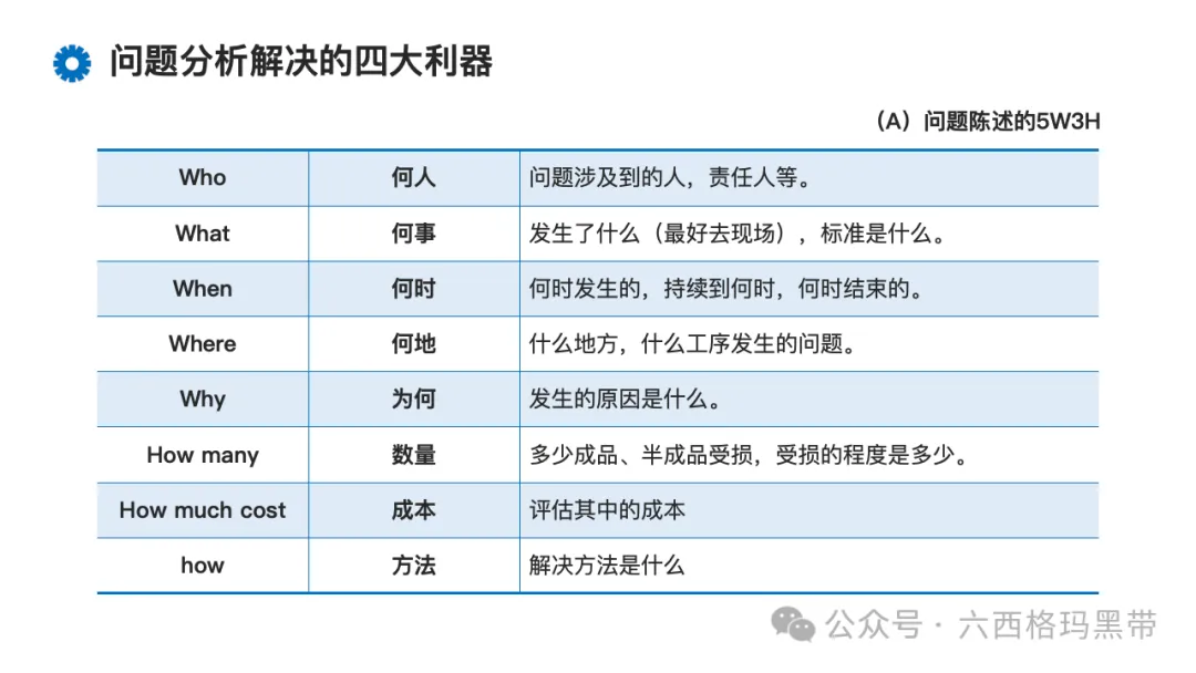 问题分析解决的四大利器包括5W3H、5个为什么、头脑风暴和防呆。