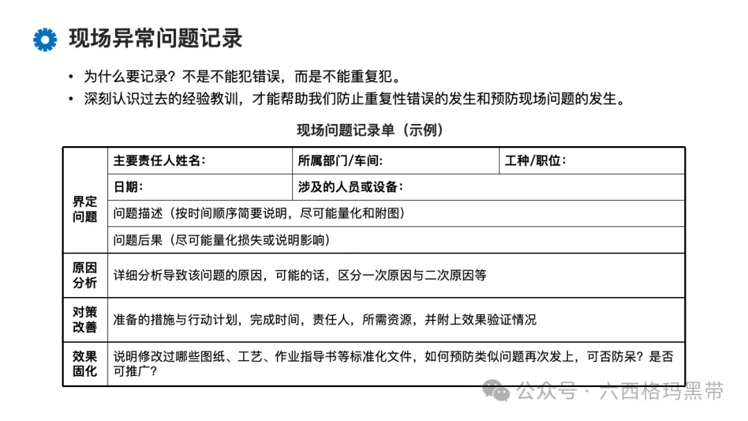 现场异常问题记录是问题管理的重要环节,通过记录问题的发生、原因、解决措施和效果,可以总结经验教训,防止问题再次发生。