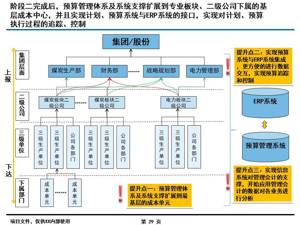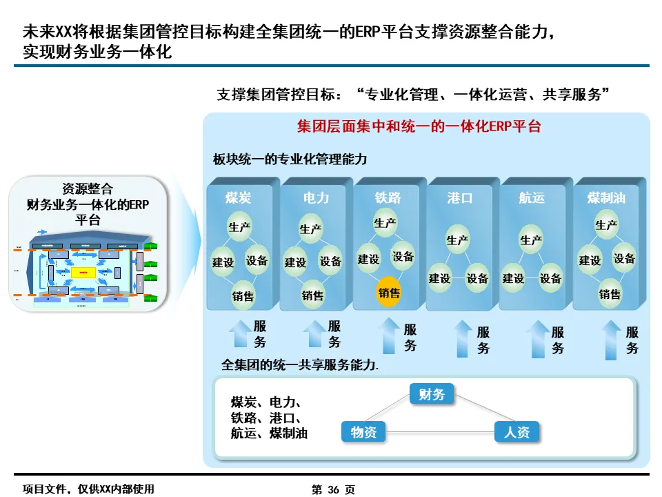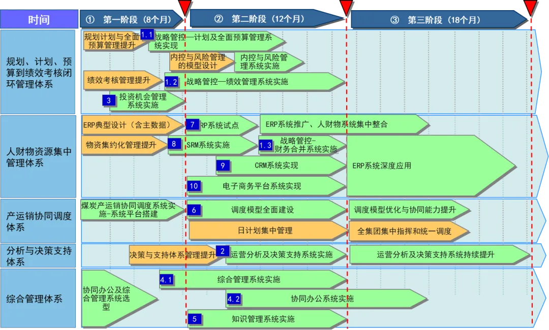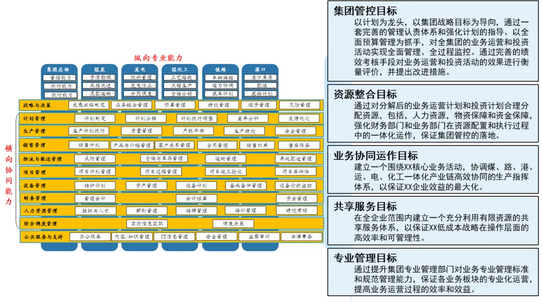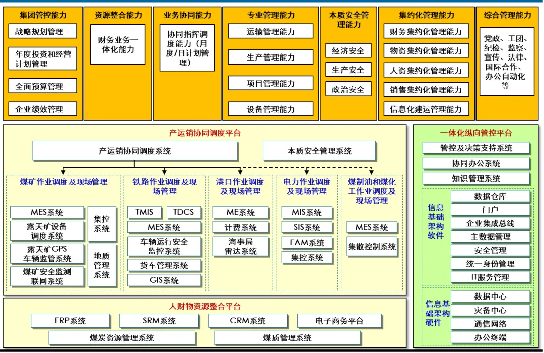 信息化蓝图的科学性在于 “统分结合” 的落地策略。报告规划了 “两横一纵” 三大平台(产运销协同调度平台、人财物资源整合平台、一体化纵向管控平台),既保障了集团层面的统一管控,又兼顾了各业务板块的个性化需求。例如,ERP 系统采用 “集团统一模板 + 板块专业模板” 的部署模式,财务、人力、物资等共性模块统一建设,煤炭生产、铁路运输等专业模块按板块定制,既避免了重复投资,又确保了业务适配性。
