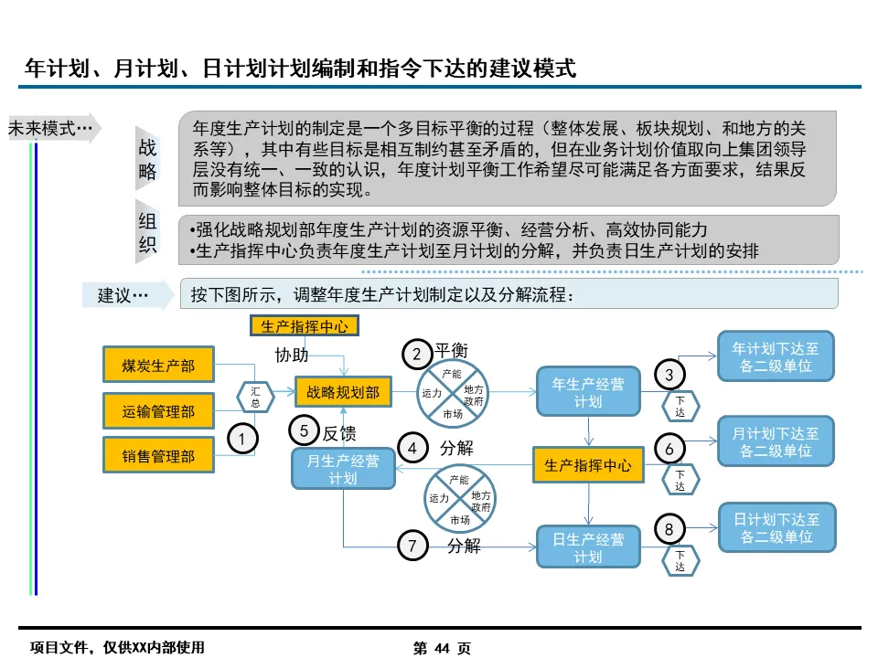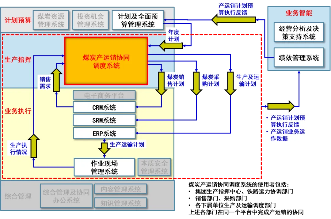 全产业链协同是某华的核心诉求,也是方案的重中之重。报告围绕 “煤 - 路 - 港 - 电 - 化” 一体化运营特点,设计了产运销协同调度体系,通过三级计划分解(年度 - 月度 - 日度)实现产能、运力、市场需求的动态平衡。针对铁路运力紧张、港口调度脱节等问题,搭建了统一的协同调度平台,打通煤炭生产、铁路运输、港口装卸、电力发电等环节的数据壁垒,实现 “生产计划 - 运输调度 - 销售执行” 的端到端可视化管控,让供应链效率提升有迹可循。