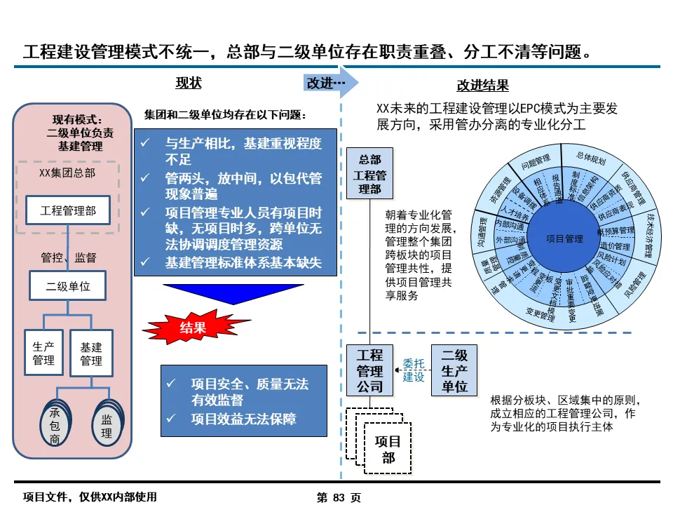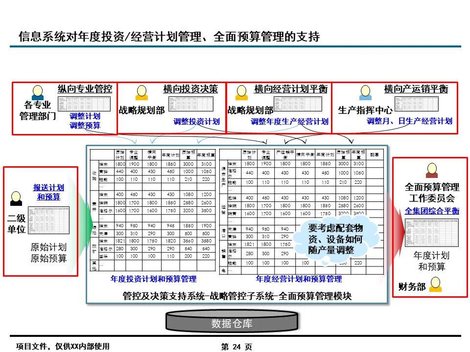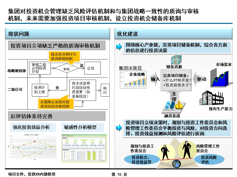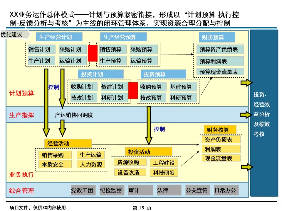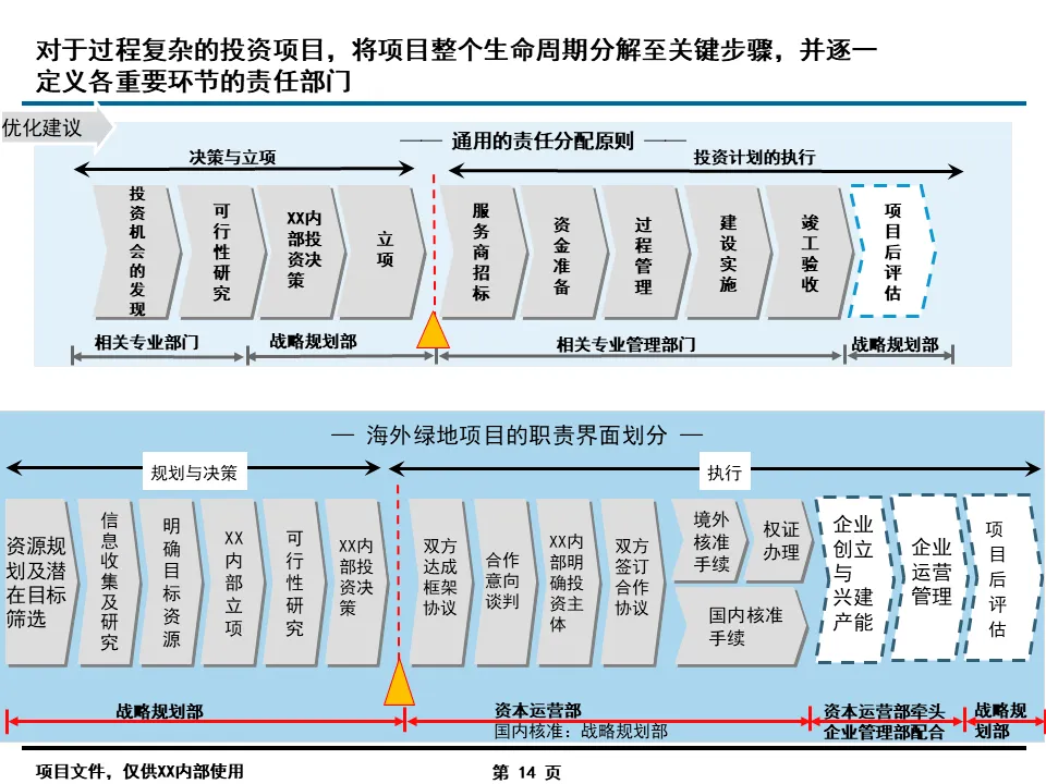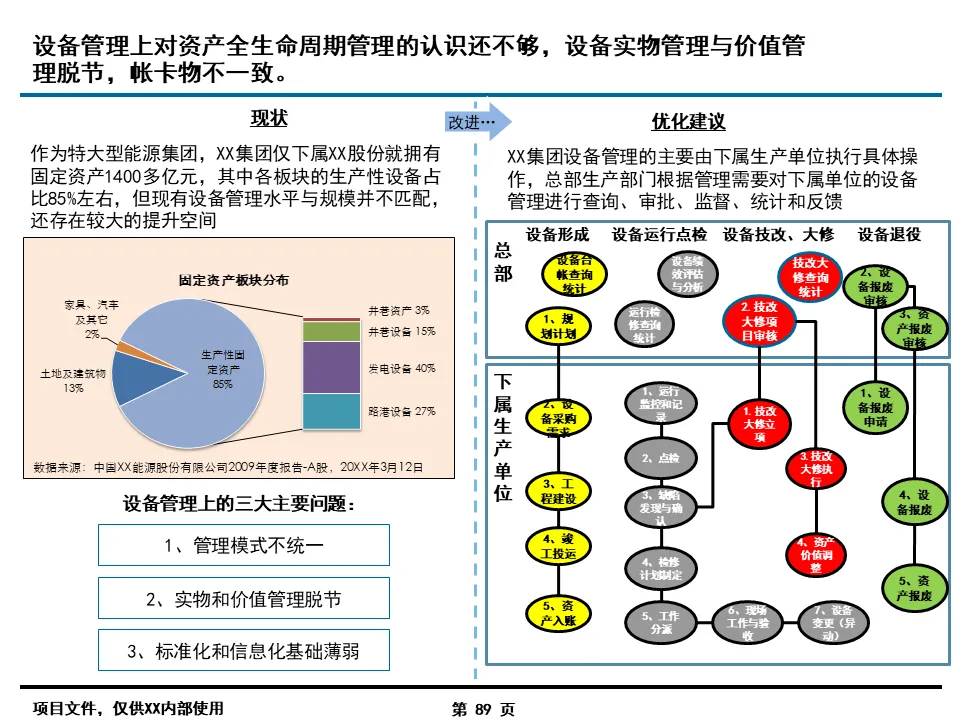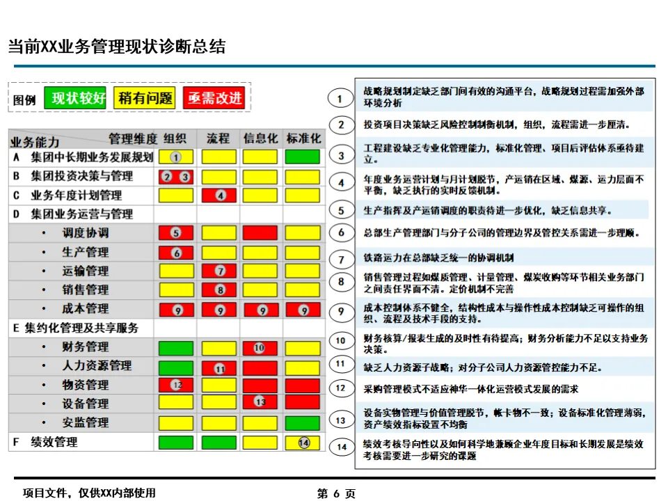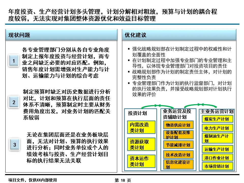 流程优化是信息化落地的前提,报告的核心突破在于打破了传统职能壁垒。针对集团总部与二级单位职责不清、协同不畅的痛点,通过 “专业工作委员会” 机制,建立了规划投资、预算考核、风险管理等六大跨部门决策平台,将 “一事一议” 的松散协作转化为标准化流程。同时,按业务类型细分 421 个核心流程,明确各环节责任主体,例如在投资项目管理中,将海外绿地项目、国内技改项目等 8 类业务的生命周期拆解,逐一定义关键节点职责,彻底解决了职责交叉、推诿扯皮的行业通病。