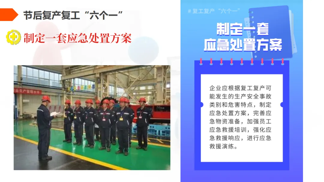 针对节后员工思想松懈、设备重新启动等特点,制定详细的复工复产方案,明确复工步骤、安全措施和应急预案。