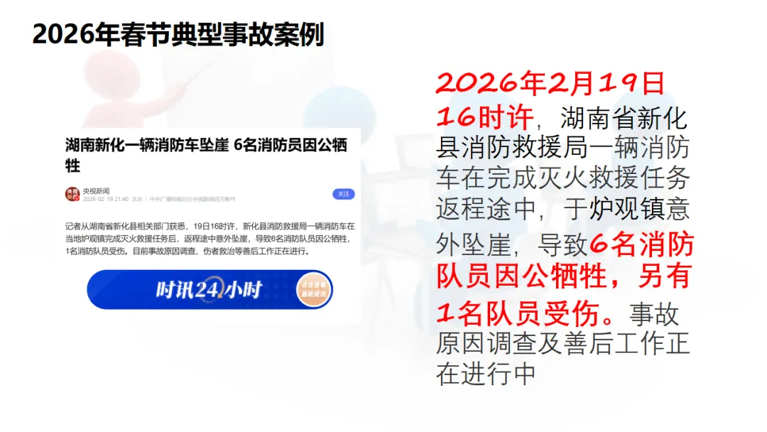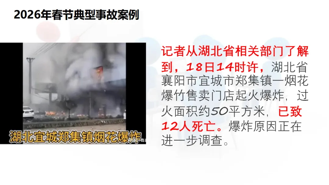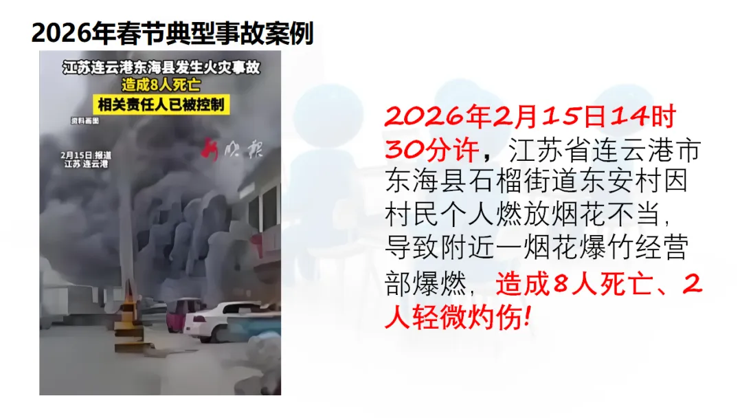 请看这样一组数据:就在刚刚过去的2026年春节期间,短短几天时间内,就发生了多起重大安全事故。2月18日,湖北襄阳宜城市郑集镇一烟花爆竹售卖门店起火爆炸,过火面积仅50平方米,却造成了12人死亡的惨痛后果。2月15日,江苏连云港东海县因村民燃放烟花不当,导致附近烟花爆竹经营部爆燃,8人死亡、2人受伤。2月17日大年初一,云南楚雄市一艘涉客船舶倾覆,4人死亡。2月19日,湖南新化县一辆消防车在返程途中坠崖,6名消防队员因公牺牲,1人受伤。