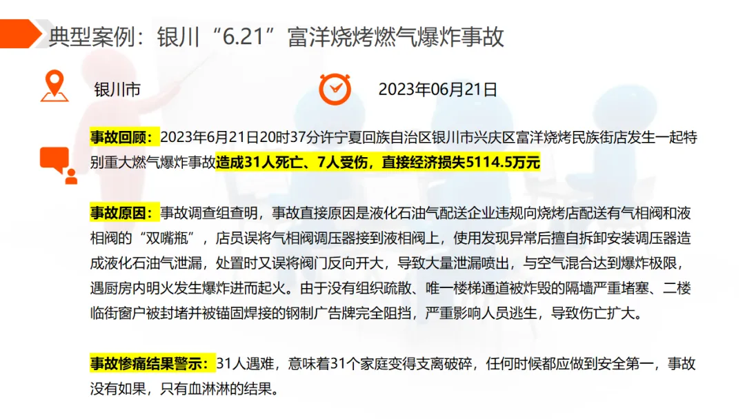理论可能比较抽象,让我们看一个真实的案例。2023年6月21日20时37分,宁夏回族自治区银川市兴庆区富洋烧烤民族街店发生了一起特别重大燃气爆炸事故。