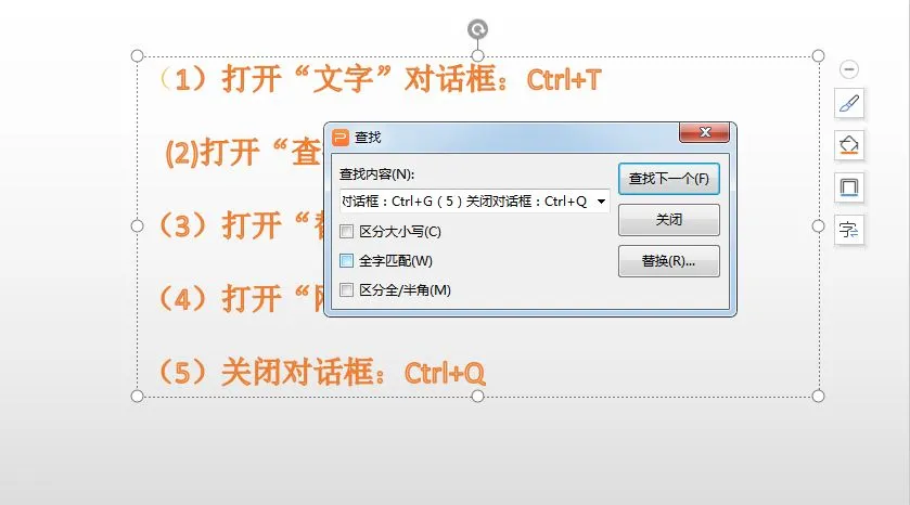 我们需要从幻灯片寻找“(5)关闭对话框:Ctrl+Q”,我们无需一页一页幻灯片中寻找,而是直接在键盘上按Ctrl+F就弹出查找窗口,就可以进行具体的操作了。