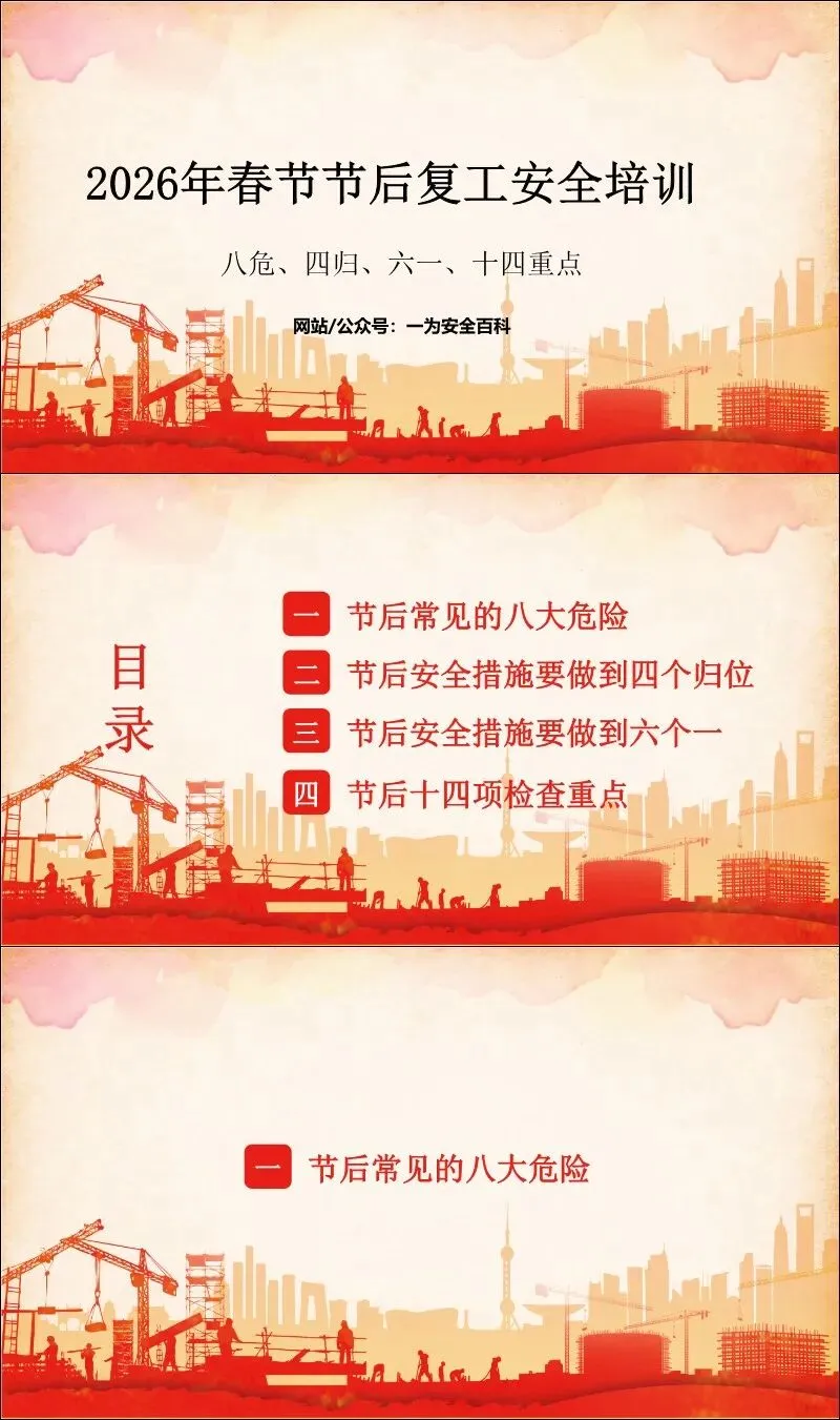 2026年春节节后复工安全培训的PPT,主题为“复工复产八危、四归、六个一、十四重点”。旨在指导企业在节后复工期间识别风险、调整状态、落实措施并进行全面检查,以确保安全生产。主要内容分为四个部分: