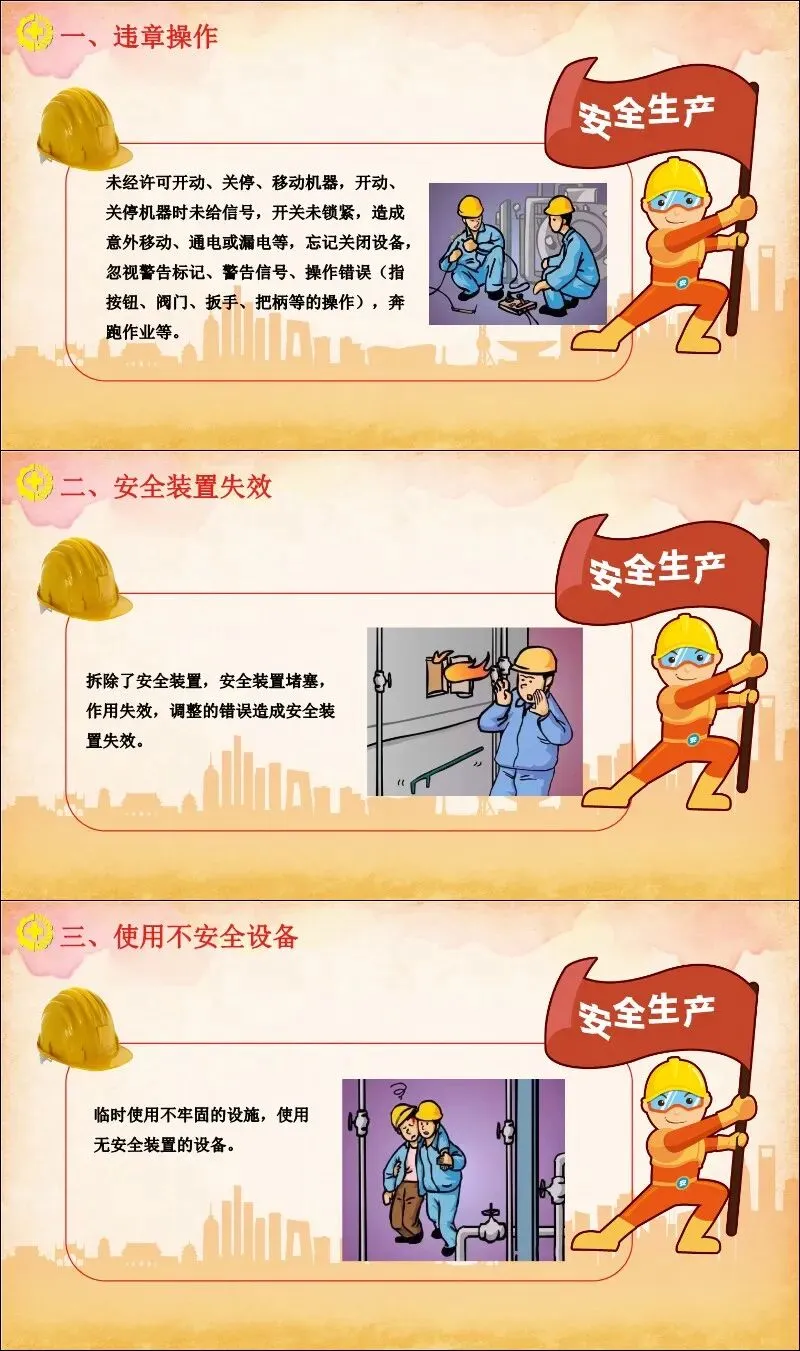 违章操作:如未经许可开关机器、忽视警告信号、操作错误、奔跑作业等。