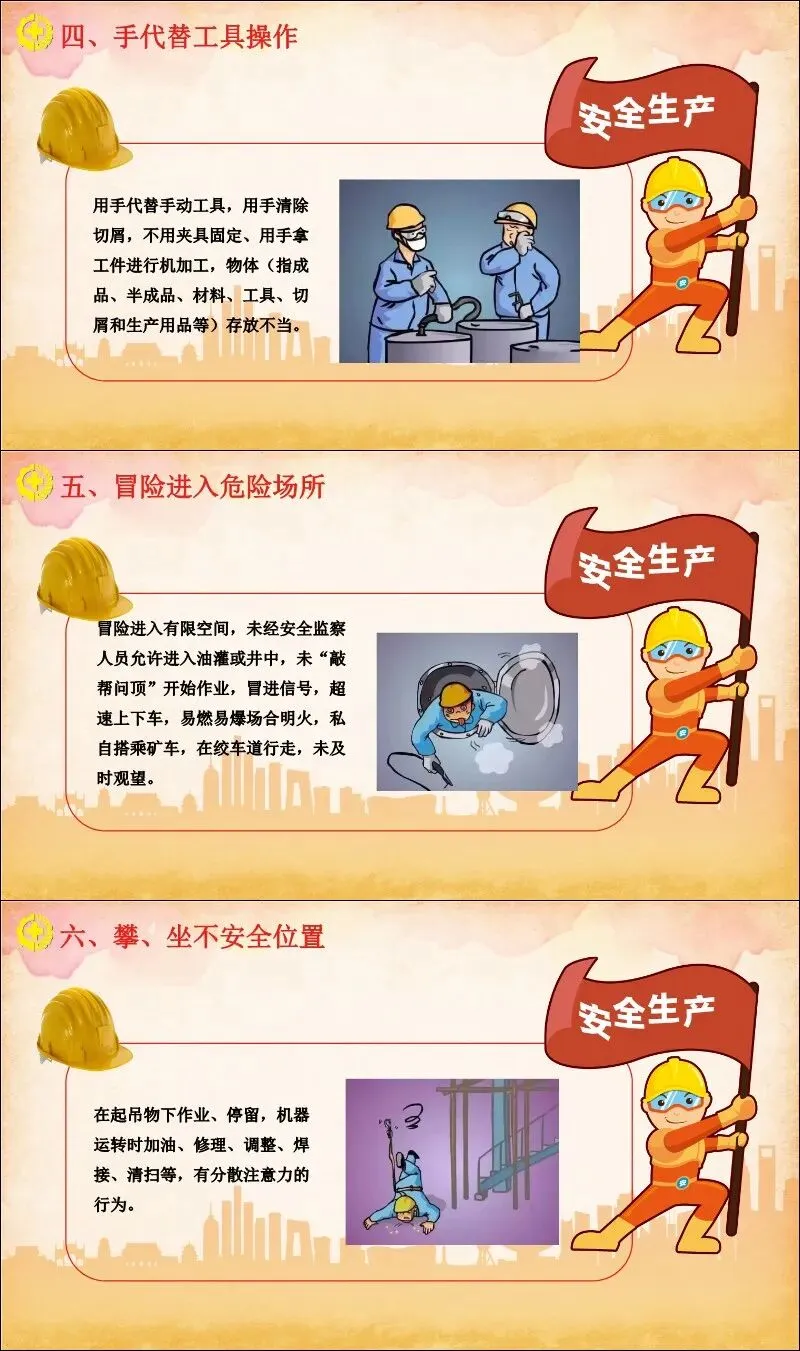 攀、坐不安全位置:在起吊物下停留、机器运转时进行维修清理、分散注意力等。