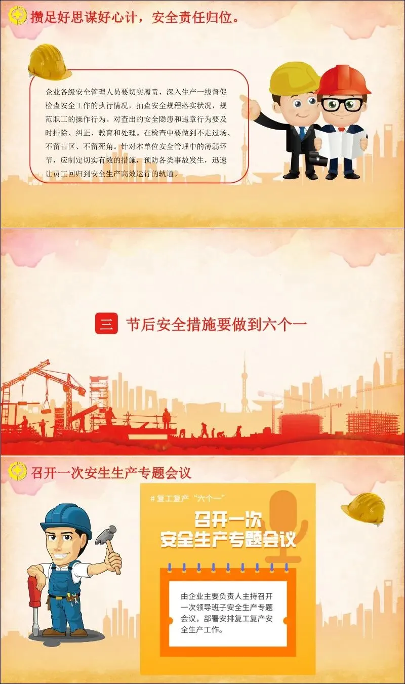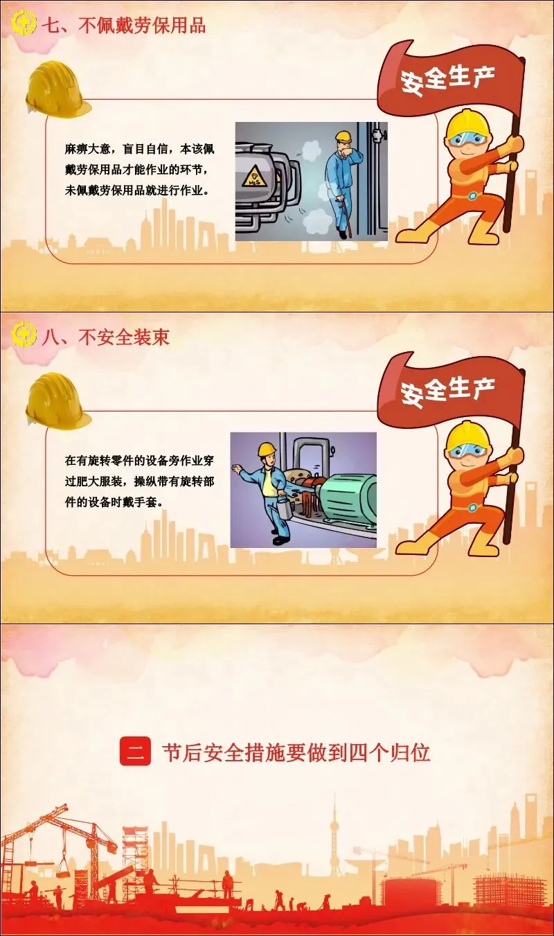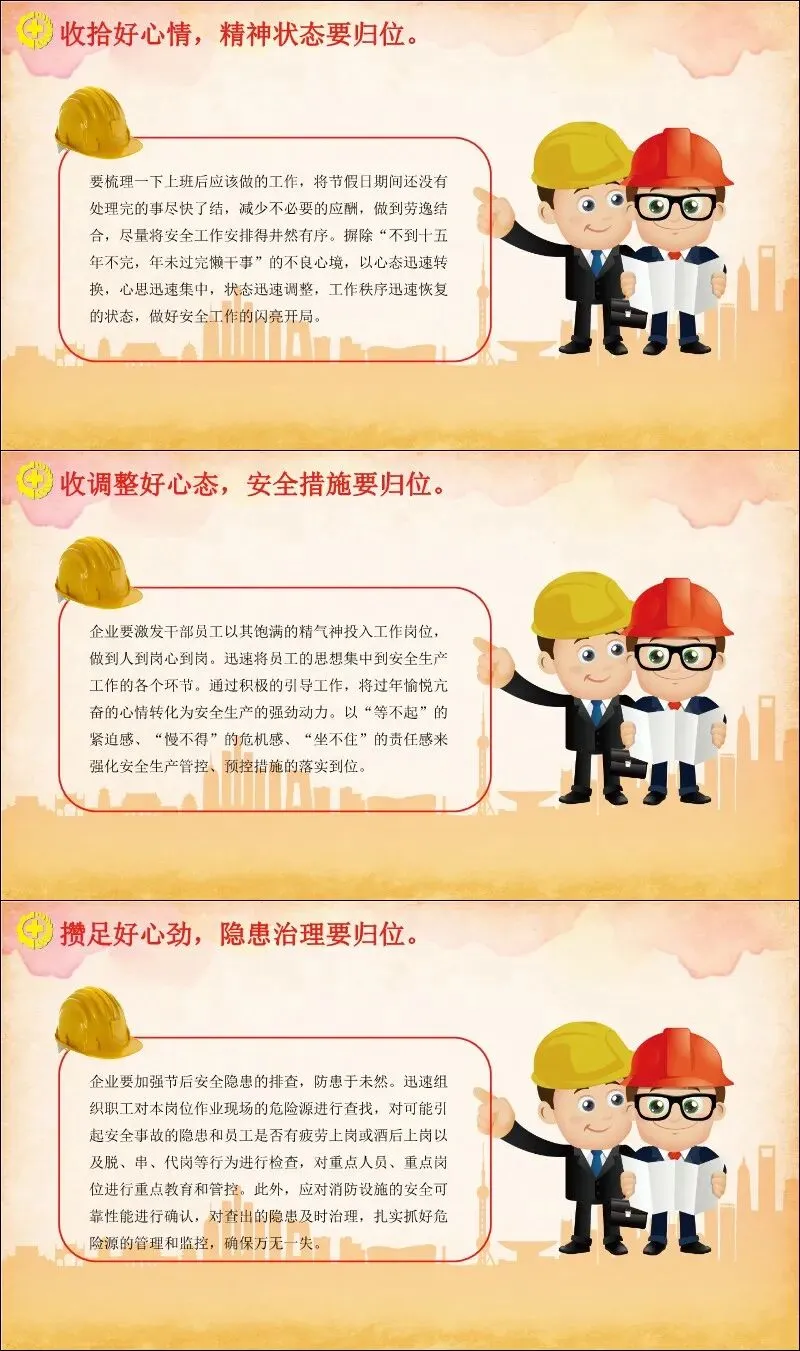 安全措施归位:调整心态,将员工思想集中到安全生产上,把节日的亢奋转化为安全工作的动力,强化管控措施。