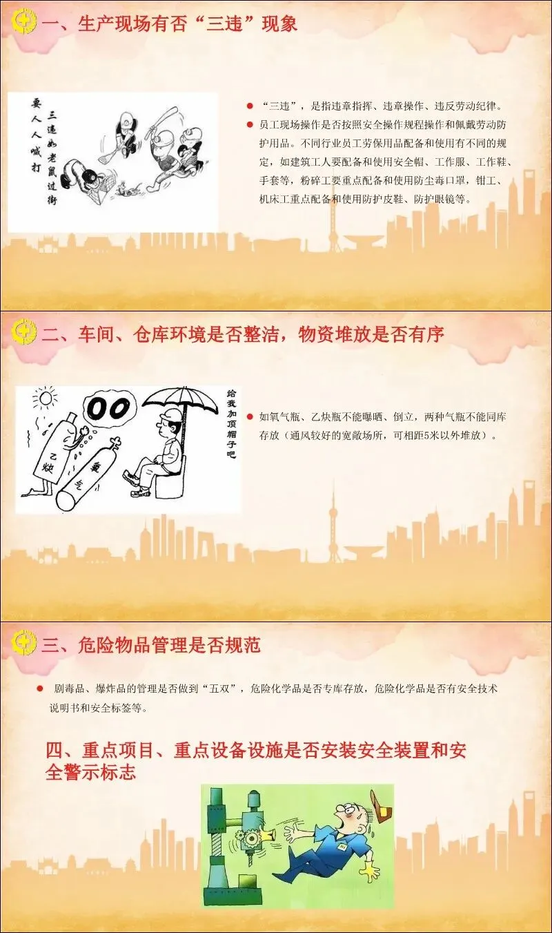 “三违”现象:检查是否有违章指挥、违章操作、违反劳动纪律,以及劳保用品佩戴情况。