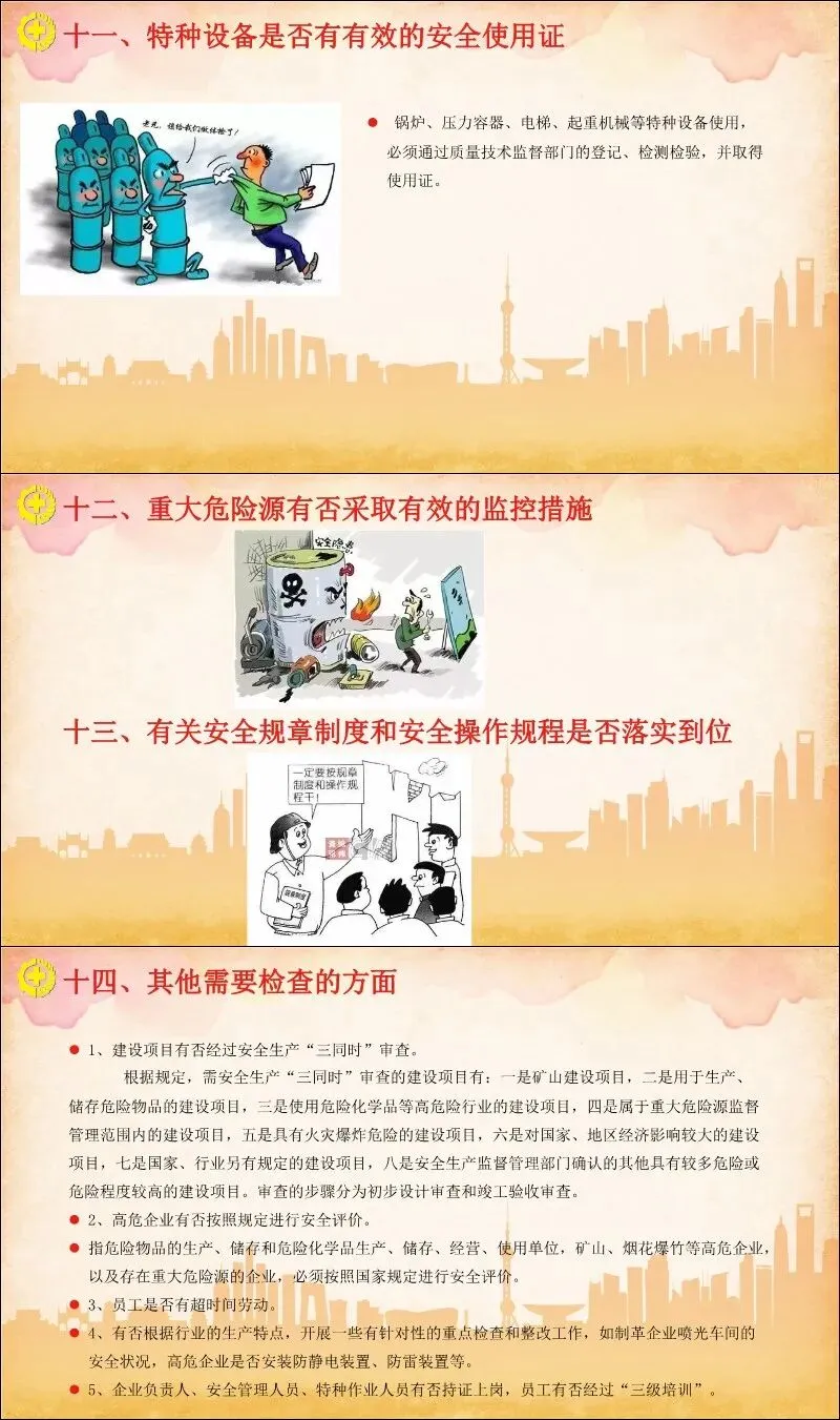 其他方面:包括建设项目“三同时”审查、高危企业安全评价、员工超时劳动、行业针对性检查(如防静电、防雷)、人员持证上岗及三级培训情况。