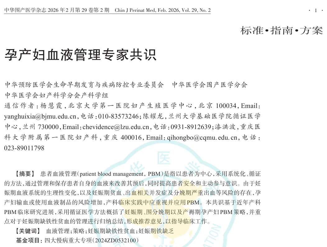 孕产妇血液管理(PBM)是以患者为中心的系统化循证医疗实践,核心在于保护和管理孕产妇自身血液、纠正贫血、减少失血,从而降低异体输血风险,改善妊娠结局。因妊娠期血液系统的生理变化,叠加贫血、胎盘异常、分娩期大出血等风险,孕产妇输血需求与风险均显著升高,做好全周期 PBM 成为产科临床的关键环节。