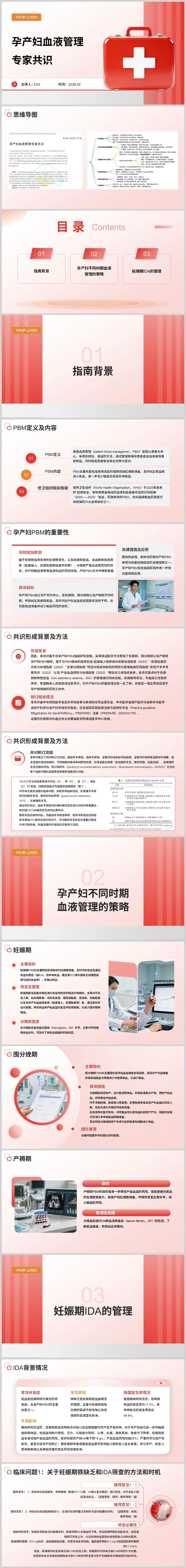 孕产妇 PBM 需分阶段实施,妊娠期聚焦红细胞储备提升与贫血筛查,需在早中晚期及分娩前多次检测血红蛋白,对素食、多胎妊娠、胎盘植入等高危人群重点监测,同时鉴别缺铁性、地中海贫血等贫血类型,其中缺铁性贫血(IDA)是最常见类型,我国妊娠期铁缺乏发生率高达 45.6%,需及时干预。围分娩期重在出血风险防控,规范助产操作、精准评估出血量,对高危产妇做好自体血回输准备,必要时组建多学科团队。产褥期则需在分娩后检测血红蛋白与血清铁蛋白,持续纠正贫血,提升产妇生理耐受能力。
