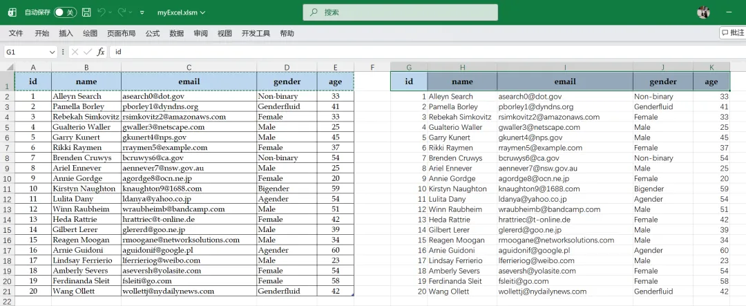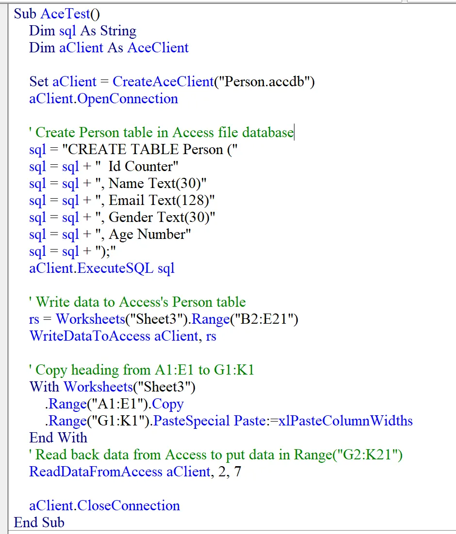 将 Excel 数据集写入数据库完成后,接下来的 With 语句是将区域 A1:E1 的内容拷贝到区域 G1:K1,实际就是拷贝数据集的表头。表头拷贝好后,调用 ReadDataFromAccess,将前面写入数据库的数据从 Person.accdb 数据库的 Person 表中读出,将这个数据集写到 G2:K21 的区域中。结果如开头所示。