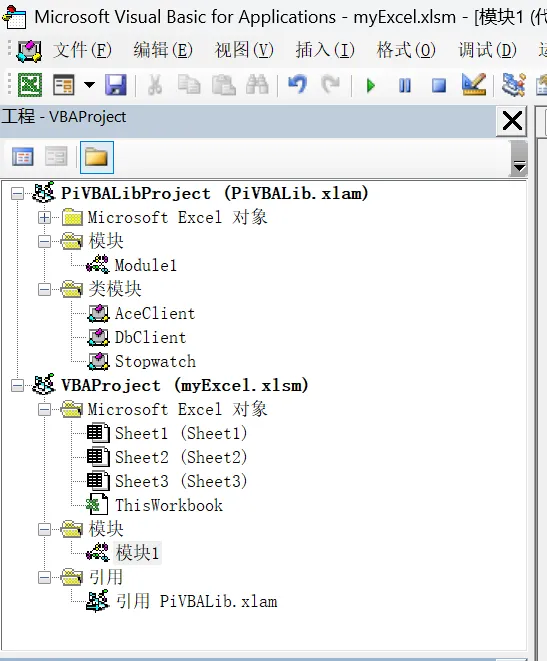 而在 AceClient 的应用方 myExcel.xlsm 中,我们的例子所使用的工作表是 Sheet3,测试程序则放在 模块1 中,另外注意到,在 myExcel 的 VBAProject 中引用了 PiVBALib。