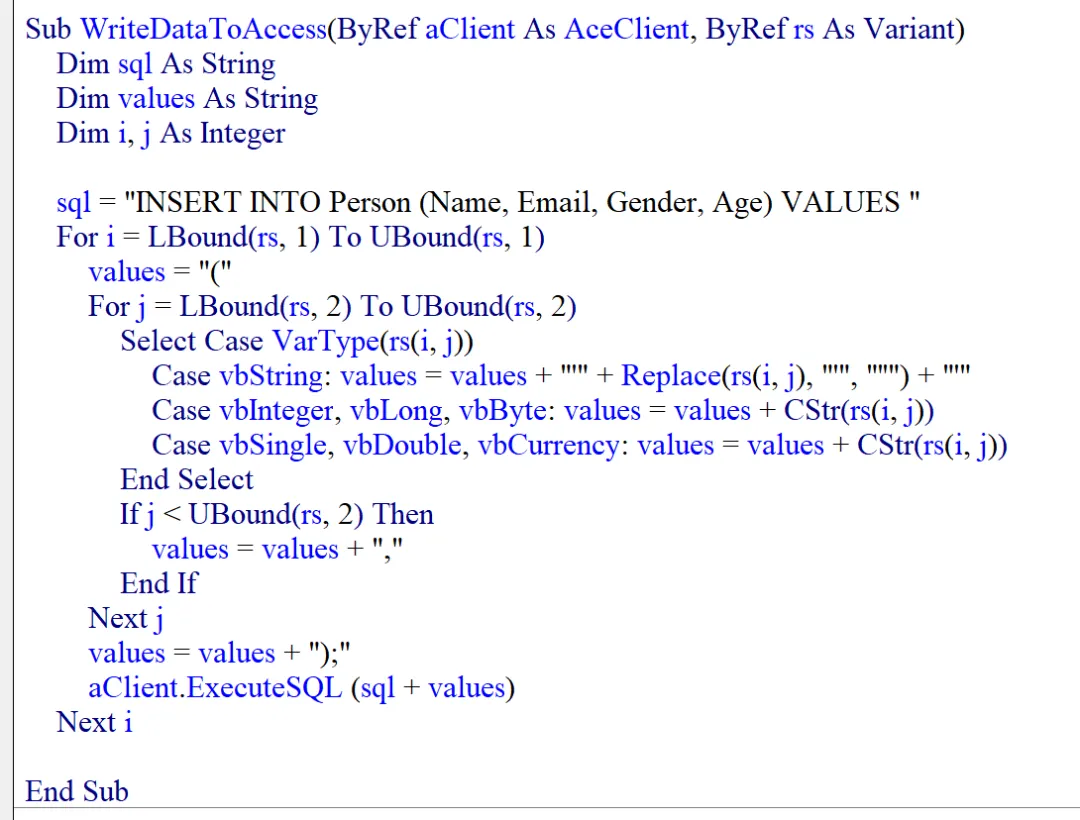 WriteDataToAccess 接受两个参数:一个是 AceClient 类型的对象 aClient,一个是变体类型的变量 rs,实际是一个二维数组。