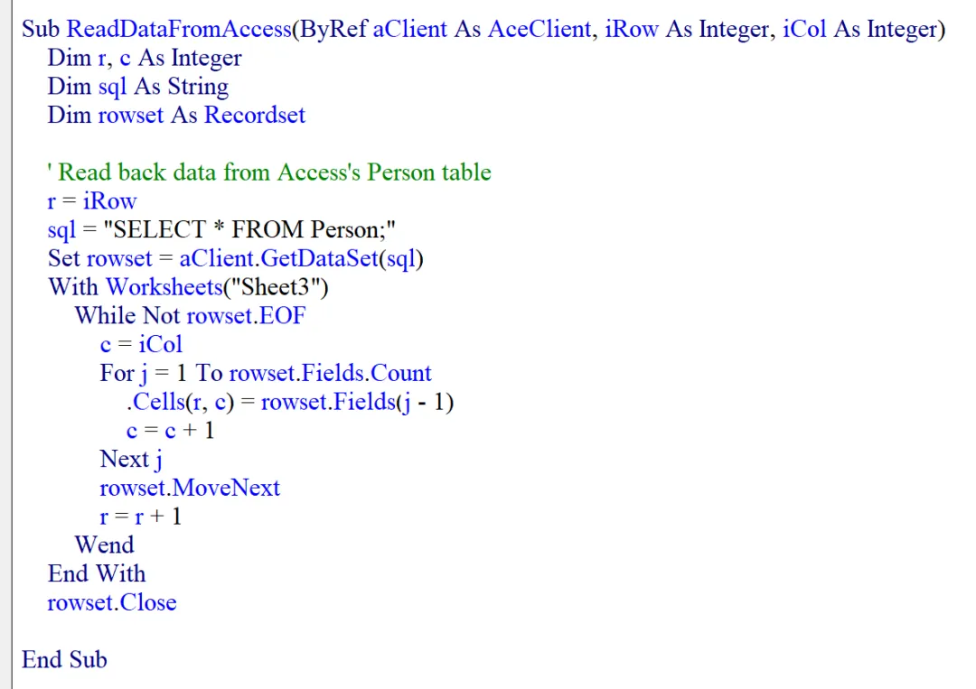 WriteDataToAccess 的过程体就是遍历 rs 这个二维数组,对每一行都构造一个 INSERT INTO 的数据插入 SQL 语句,然后调用 aClient.ExecuteSQL 执行该 SQL 语句,结果就是向 Person 表中插入一条记录。遍历完所有的行之后,整个数据集的写入数据库就完成了。