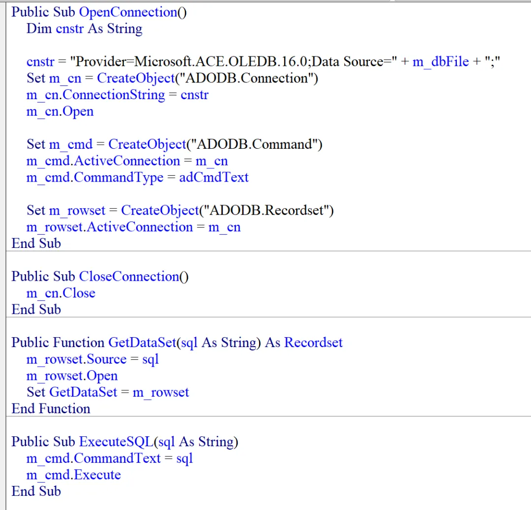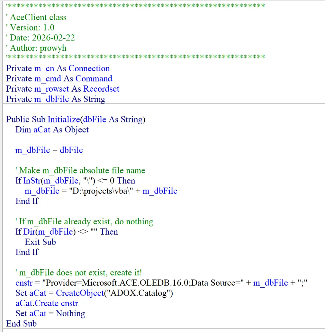 接下来是 AceClient 类的第一个方法(注意:在类中定义的 Sub/Function 都统称为“方法”)Initialize,该方法接受一个参数,即 Access 数据库的文件名(我们说 Access 是文件型数据库系统)。