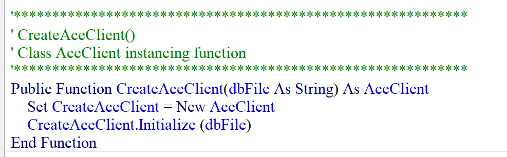 函数 CreateAceClient 在 PiVBALib 中的模块 Module1 中定义,用来创建 AceClient 类的实例,并调用该实例的 Initialize 方法对其进行初始化。