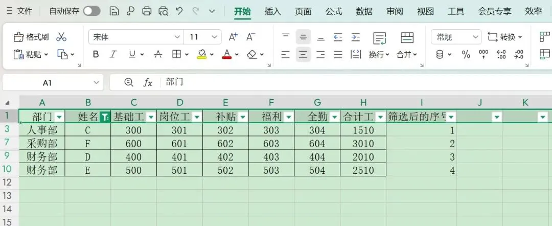 此公式完成后,可以试验一下,比如筛选“姓名”C、F、D、E“,则筛选后的序号会自动变成1、2、3、4。