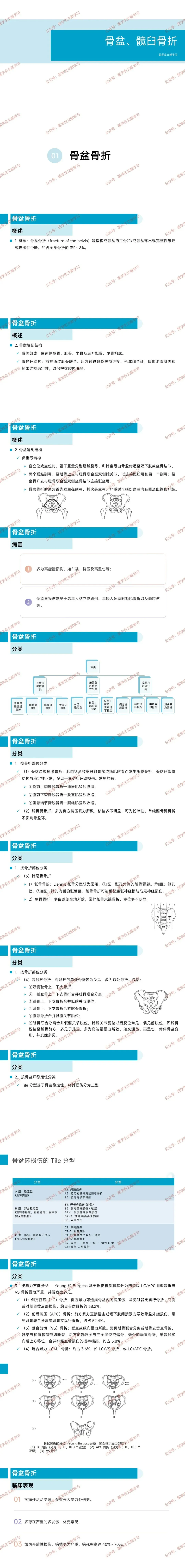 解剖结构:由髂骨、耻骨、坐骨、骶骨、尾骨构成,通过耻骨联合和骶髂关节形成闭合环,负重弓包括骶股弓、骶坐弓及联结副弓,骨折时副弓先受损,可累及盆腔脏器。