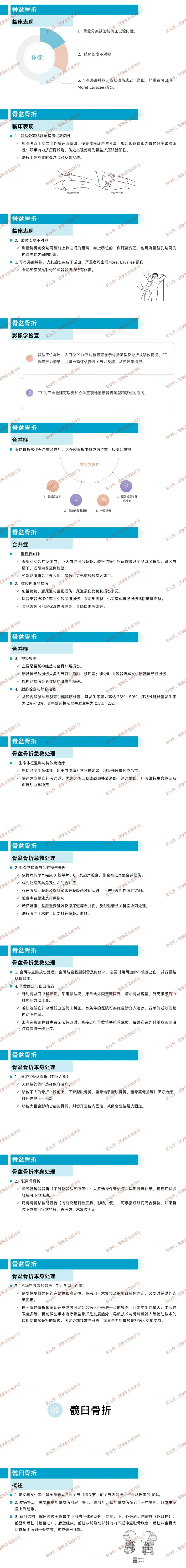 骨盆骨折:高能量损伤为主,分型多样,合并症凶险(如腹膜后血肿),急救需抗休克及固定,手术以恢复稳定性为核心。