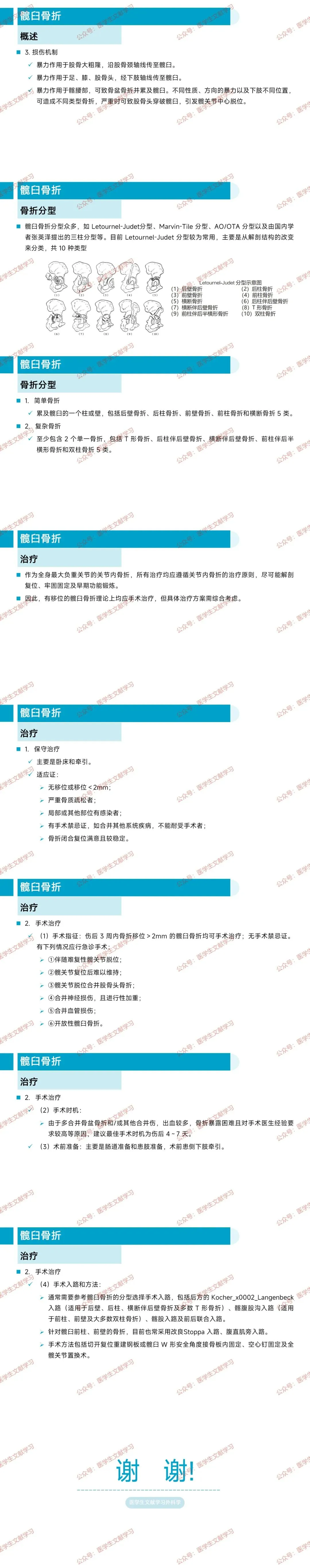 髋臼骨折:关节内骨折,Letournel-Judet 分型指导手术,治疗目标为解剖复位,手术入路根据骨折类型选择,微创技术提升精准度。