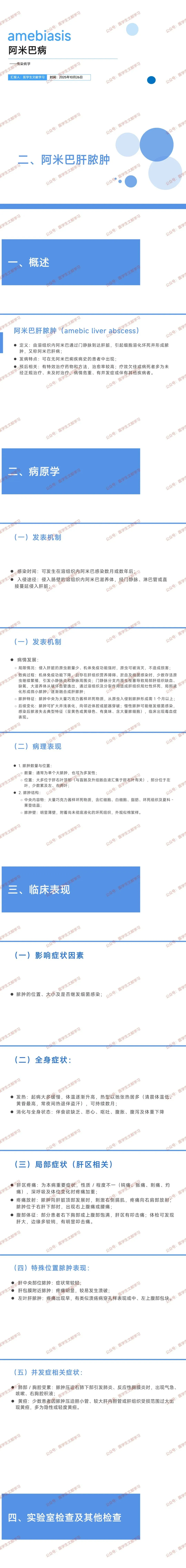 定义:溶组织内阿米巴通过门静脉侵入肝脏,导致肝细胞坏死液化形成的脓肿,又称阿米巴肝病,可无阿米巴痢疾病史。
