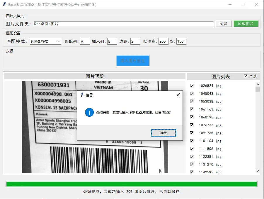 import tkinter as tkfrom tkinter import ttkclass ExcelImageMatcherPro:    def __init__(self, root):        self.root = root        self.root.title("Excel批量添加图片批注(欢迎关注微信公众号:码海听潮)")        self.root.geometry("900x650")        self.root.resizable(FalseFalse)        # 设置中文字体        self.font_family = ("SimHei", "WenQuanYi Micro Hei", "Heiti TC")        # 创建UI        self.create_widgets()    def create_widgets(self):        # 主框架 - 使用grid作为根布局        main_frame = tk.Frame(self.root, bg="#f0f0f0")        main_frame.pack(fill=tk.BOTH, expand=True, padx=10, pady=10)        # 配置grid行列权重        main_frame.grid_rowconfigure(1, weight=1)  # 中间行可扩展        main_frame.grid_columnconfigure(0, weight=1)        # ==================== 顶部控制区域 ====================        top_frame = tk.Frame(main_frame, bg="#f0f0f0", height=210)        top_frame.grid(row=0, column=0, sticky="ew", pady=(0, 10))        top_frame.grid_propagate(False)        # 第一行控制 - 图片文件夹选择        folder_frame = ttk.LabelFrame(top_frame, text=" 图片文件夹 ", padding=(5, 5, 5, 5))        folder_frame.pack(fill=tk.X, pady=(5, 0))        folder_label = tk.Label(folder_frame, text="图片文件夹:", bg="#f0f0f0", font=(self.font_family[0], 11))        folder_label.pack(side=tk.LEFT, padx=(0, 5))        self.folder_path_var = tk.StringVar()        folder_entry = tk.Entry(folder_frame, textvariable=self.folder_path_var, font=(self.font_family[0], 10),                              width=40)        folder_entry.pack(side=tk.LEFT, fill=tk.X, expand=True, padx=(0, 5))        browse_folder_btn = tk.Button(folder_frame, text="浏览", command=self.select_folder,                                    font=(self.font_family[0], 10), cursor="hand2", padx=10)        browse_folder_btn.pack(side=tk.LEFT)        load_btn = tk.Button(folder_frame, text="加载图片", command=self.load_images_from_entry,                           font=(self.font_family[0], 10), bg="#4CAF50", fg="white",                           cursor="hand2", padx=10)        load_btn.pack(side=tk.RIGHT, padx=(5, 0))        # 第二行控制 - 模式选择和参数设置(紧凑布局)        control_row2 = ttk.LabelFrame(top_frame, text=" 匹配设置 ", padding=(5, 3, 5, 3))        control_row2.pack(fill=tk.X, pady=(5, 0))        settings_container = tk.Frame(control_row2, bg="#f0f0f0")        settings_container.pack(fill=tk.X, padx=3, pady=3)        # 模式选择        mode_frame = tk.Frame(settings_container, bg="#f0f0f0")        mode_frame.pack(side=tk.LEFT, padx=(0, 8))        mode_label = tk.Label(mode_frame, text="匹配模式:", font=(self.font_family[0], 11))        mode_label.pack(side=tk.LEFT, padx=(0, 5))        self.mode_var = tk.StringVar(value="列匹配模式")        mode_combo = ttk.Combobox(mode_frame, textvariable=self.mode_var, values=["列匹配模式", "行匹配模式"],                                 width=12, state="readonly")        mode_combo.pack(side=tk.LEFT)        mode_combo.bind("<<ComboboxSelected>>", self.on_mode_change)        # 参数区域 - 紧凑排列        params_frame = tk.Frame(settings_container, bg="#f0f0f0")        params_frame.pack(side=tk.LEFT, fill=tk.X, expand=True)        # ========== 列模式参数 ==========        self.col_param_frame = tk.Frame(params_frame, bg="#f0f0f0")        # 匹配列        col_match_frame = tk.Frame(self.col_param_frame, bg="#f0f0f0")        col_match_frame.pack(side=tk.LEFT, padx=2)        ttk.Label(col_match_frame, text="匹配列:", font=(self.font_family[0], 10))\            .pack(side=tk.LEFT, padx=0, pady=0)        self.col_match_entry = ttk.Entry(col_match_frame, width=4)        self.col_match_entry.pack(side=tk.LEFT, padx=1)        self.col_match_entry.insert(0, "A")        # 插入列        col_insert_frame = tk.Frame(self.col_param_frame, bg="#f0f0f0")        col_insert_frame.pack(side=tk.LEFT, padx=2)        ttk.Label(col_insert_frame, text="插入列:", font=(self.font_family[0], 10))\            .pack(side=tk.LEFT, padx=0, pady=0)        self.col_insert_entry = ttk.Entry(col_insert_frame, width=4)        self.col_insert_entry.pack(side=tk.LEFT, padx=1)        self.col_insert_entry.insert(0, "B")        # 边距        col_margin_frame = tk.Frame(self.col_param_frame, bg="#f0f0f0")        col_margin_frame.pack(side=tk.LEFT, padx=2)        ttk.Label(col_margin_frame, text="边距:", font=(self.font_family[0], 10))\            .pack(side=tk.LEFT, padx=0, pady=0)        self.col_margin_entry = ttk.Entry(col_margin_frame, width=4)        self.col_margin_entry.pack(side=tk.LEFT, padx=1)        self.col_margin_entry.insert(0, "2")        # 批注大小设置        comment_size_frame = tk.Frame(self.col_param_frame, bg="#f0f0f0")        comment_size_frame.pack(side=tk.LEFT, padx=5)        ttk.Label(comment_size_frame, text="批注宽:", font=(self.font_family[0], 10))\            .pack(side=tk.LEFT, padx=0, pady=0)        self.comment_width_entry = ttk.Entry(comment_size_frame, width=4)        self.comment_width_entry.pack(side=tk.LEFT, padx=1)        self.comment_width_entry.insert(0, "200")        ttk.Label(comment_size_frame, text="高:", font=(self.font_family[0], 10))\            .pack(side=tk.LEFT, padx=0, pady=0)        self.comment_height_entry = ttk.Entry(comment_size_frame, width=4)        self.comment_height_entry.pack(side=tk.LEFT, padx=1)        self.comment_height_entry.insert(0, "150")   