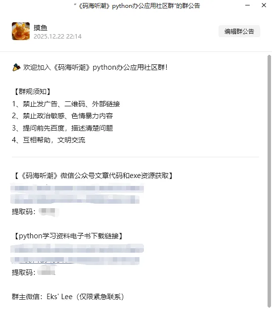 另外,《码海听潮》公众号所有文章码和exe程序已打包好上传绿联nas私有云,有需要的大佬扫一扫上面博主的个人微信二维码,需要的大佬需支付9.9元永久拥有公众号资源(写原创干货费时费力,属实不易),邀请您进入社区群获取下载链接!!,群内提供python办公自动化交流问题,解决问题,且码海听潮微信公众号文章发布会第一时间会更新到群里,非诚勿扰哈!
