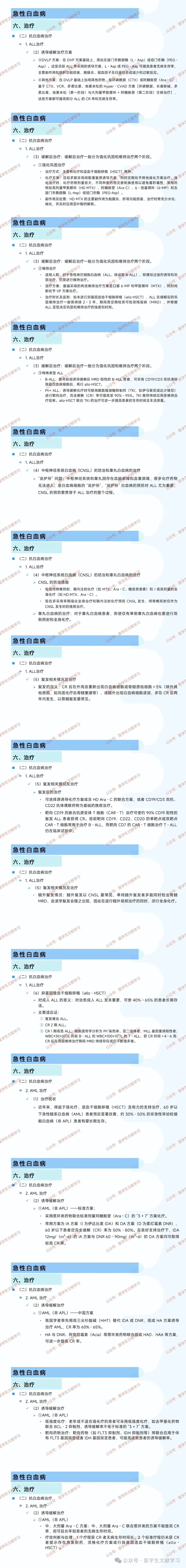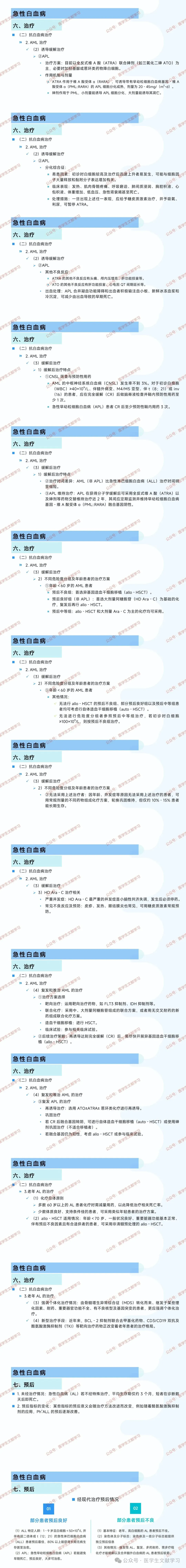 主要方法是联合化疗,目标是使患者迅速获得完全缓解(CR),CR 标准包括白血病症状和体征消失、外周血无原始细胞且无髓外白血病、骨髓三系血细胞造血恢复且原始细胞<5%、外周血中性粒细胞>1.0×10⁹/L 且血小板≥100×10⁹/L。达到 CR 后进入缓解后治疗阶段,主要方法是化疗和造血干细胞移植(HSCT)。诱导缓解获 CR 后,体内残留的白血病细胞为 MRD,MRD 水平可预测复发,需定期监测,MRD 持续阴性的患者有望长期无病生存。儿童 ALL 长期无病生存率(DFS)达 80% 以上,青少年 ALL 适宜采用儿童方案治疗。成人 ALL 完全缓解(CR)率可达 80% - 90%,治疗方案根据患者年龄、ALL 亚型、治疗后的可检测残留病(MRD)、是否有干细胞供体以及靶向治疗药物等因素确定。诱导缓解治疗方案有 VP 方案(长春新碱和泼尼松)、DVP 方案(VP 方案加蒽环类药物)、DVLP 方案(DVP 方案加左旋门冬酰胺酶或培门冬酶)等,还有在此基础上添加其他药物的方案。缓解后治疗分为强化巩固和维持治疗。强化巩固治疗采用间歇重复原诱导方案,定期给予其他强化方案,化疗药物剂量宜大,常用高剂量甲氨蝶呤(HD MTX)等药物,HD MTX 治疗时需充分水化、碱化,并及时应用亚叶酸钙解救。维持治疗适用于 ALL(除成熟 B - ALL),采用口服 6 - 巯基嘌呤(6 - MP)和甲氨蝶呤(MTX),同时间断给予 VP 方案化疗,未进行 allo - HSCT 的 ALL 缓解后巩固维持治疗需持续 2 - 3 年,期间定期检测 MRD,根据 ALL 亚型决定治疗强度和时间。特殊类型 ALL 如 B - ALL,诱导缓解后 MRD 阳性患者,可采用 CD19/CD3 双抗清除残留白血病细胞后,再行 allo - HSCT;Ph + ALL 诱导缓解化疗时联用酪氨酸激酶抑制剂(TKI)进行靶向治疗,TKI 推荐持续应用至维持治疗结束,allo - HSCT 联合 TKI 可提高患者生存时间和生活质量。中枢神经系统白血病(CNSL)和睾丸白血病因存在血脑屏障和血睾屏障,是白血病细胞的 “庇护所”,CNSL 的预防贯穿 ALL 治疗全程。防治措施包括颅脊椎照射、鞘内注射化疗和 / 或高剂量的全身化疗,现在多采用早期强化全身治疗和鞘内注射化疗预防,颅脊椎照射仅作为挽救治疗。睾丸白血病患者即使单侧患病也需进行双侧照射和全身化疗。CR 后外周血重新出现白血病细胞或骨髓原始细胞>5%(除外其他原因),或髓外出现白血病细胞浸润,多在 CR 后两年内发生,以骨髓复发最常见。复发后可选择原诱导化疗方案或含 HD Ara - C 的联合方案,或者 CD19/CD3 双抗、CD22 抗体偶联药物为基础的挽救治疗。靶向 CD19 的嵌合抗原受体 T 细胞(CAR - T)治疗可使约 90% CD19 阳性的复发 ALL 患者获得 CR,目前靶向 CD19、CD22、CD20 的单靶点或双靶点 CAR - T 细胞常用于治疗 B - ALL,靶向 CD7 的 CAR - T 细胞治疗 T - ALL 仍在临床试验中。髓外复发以 CNSL 最常见,单纯髓外复发者多能同时检出骨髓 MRD,血液学复发会随之出现,因此在进行髓外局部治疗的同时,须行全身化疗。allo - HSCT 对治愈成人 ALL 至关重要,可使 40% - 65% 的患者长期存活。主要适应证包括复发难治 ALL、CR 2 期 ALL、CR 1 期高危 ALL(如细胞遗传学分析为 Ph⁺染色体、亚二倍体者等)。近年来,60 岁以下 AML 患者预后显著改善,约 30% - 50% 的非急性早幼粒细胞白血病(非 APL)患者有望长期生存。AML(非 APL)标准方案采用蒽环类药物联合标准剂量阿糖胞苷(Ara - C)的 “3 + 7” 方案化疗,常用 IA 方案和 DA 方案,60 岁以下患者总完全缓解(CR)率为 50% - 80%。我国学者用高三尖杉酯碱(HHT)替代 IDA 或 DNR,组成 HA 方案诱导治疗 AML,CR 率为 60% - 65%,HA 与其他蒽环类药物联合可提高 CR 率。老年或不适合强化疗的患者可采用低强度化疗,如去甲基化药物联合 BCL - 2 抑制剂,诱导缓解率不低于标准的 “3 + 7” 方案。靶向药物(如 FLT3 抑制剂、IDH 抑制剂等)联合应用于伴有 FLT3 基因突变或者 IDH 基因突变患者,可提高诱导缓解率。中、大剂量 Ara - C 联合蒽环类的方案不能提高 CR 率,但可延长年轻患者的无病生存时间。1 个疗程获 CR 者无病生存时间长,2 个标准疗程仍未获 CR 者提示存在原发耐药,须换化疗方案或行 allo - HSCT。APL 目前以全反式维 A 酸(ATRA)联合砷剂(如三氧化二砷 ATO)为主,必要时加羟基脲或蒽环类药物降白细胞。ATRA 作用于维 A 酸受体 α(RARA),诱导 APL 细胞分化成熟;砷剂小剂量诱导分化,大剂量诱导凋亡。初诊时白细胞较高及治疗后迅速上升的 APL 患者易发生分化综合征,表现为发热、呼吸窘迫等,一旦出现应给予糖皮质激素治疗,并吸氧、利尿,可暂停 ATRA。ATRA 还有头痛、颅内压增高、肝功能损害等不良反应;ATO 有肝功能损害、心电图 QT 间期延长等不良反应。APL 合并凝血功能障碍和出血者积极输注血小板、新鲜冰冻血浆和冷沉淀,可减少早期死亡。AML 的 CNSL 发生率不到 3%,对于特定高危患者,如初诊白细胞(WBC)≥40×10⁹/L、伴髓外病变等,应在 CR 后做脑脊液检查并鞘内预防性用药。APL 患者 CR 后至少预防性鞘内用药 3 次。AML(非 APL)治疗时间比 ALL 明显缩短。APL 获得分子学缓解后采用 ATRA 以及砷剂等药物交替维持治疗近 2 年,定期监测并维持 PML::RARA 融合基因阴性。年龄<60 岁的 AML 患者,预后不良组首选 allo - HSCT;预后良好组(非 APL)首选大剂量阿糖胞苷(HD Ara - C)为基础的化疗,复发后再行 allo - HSCT;预后中等组 allo - HSCT 和大剂量 Ara - C 为主的化疗均可采用。无法行 allo - HSCT 的患者,根据不同危险度分组考虑行 auto - HSCT。无法进行危险度分组者参照预后中等组治疗,若初