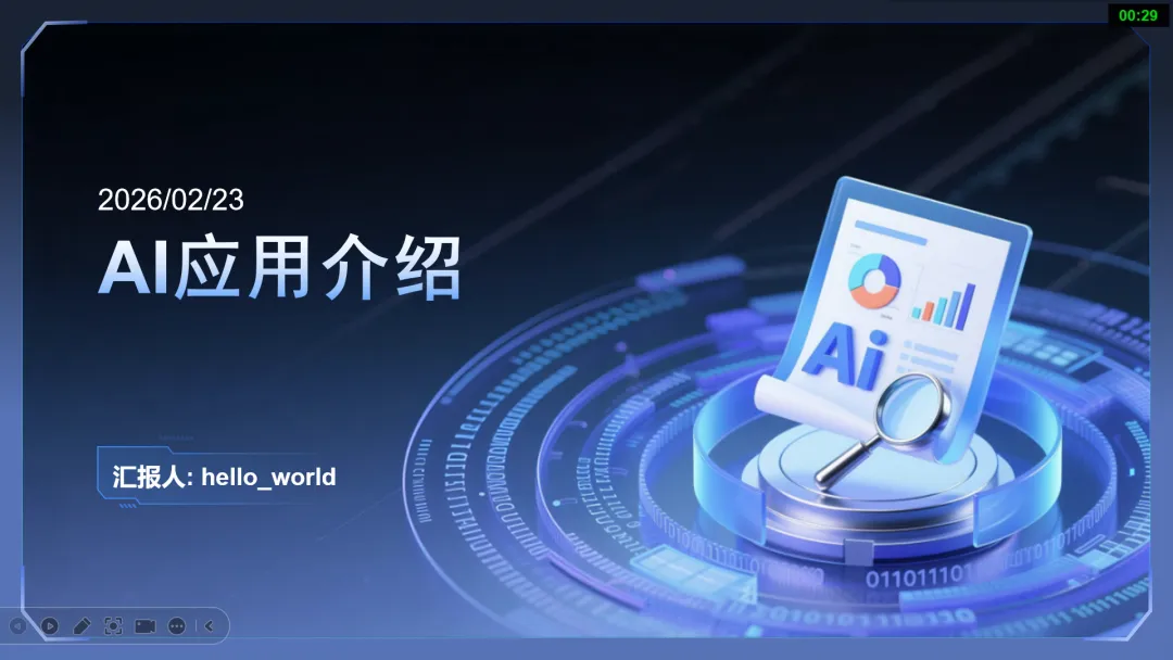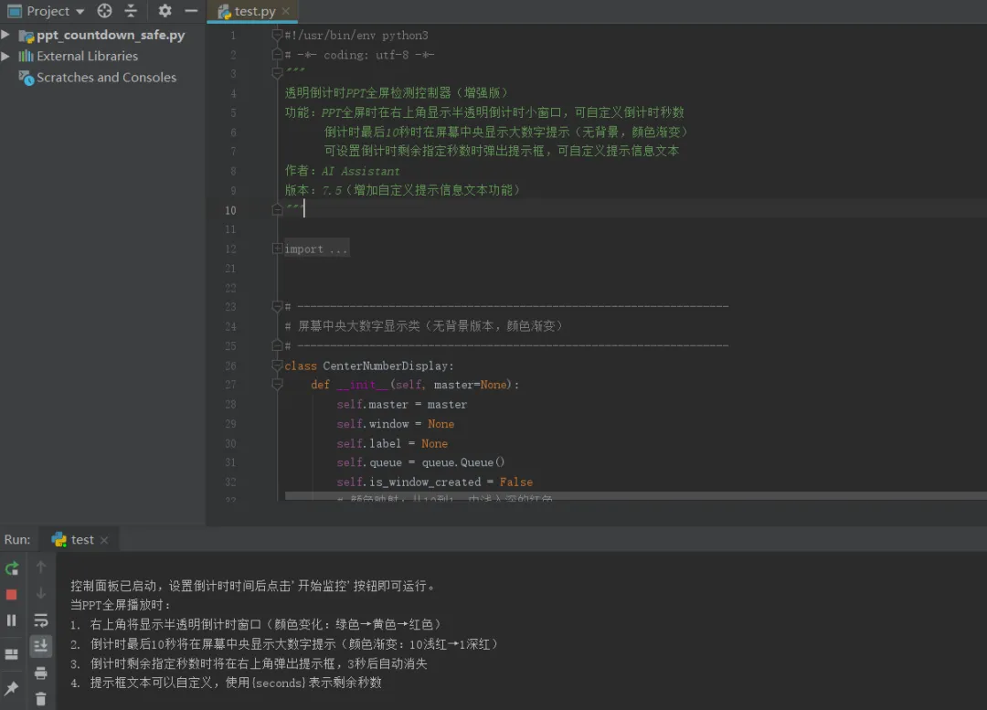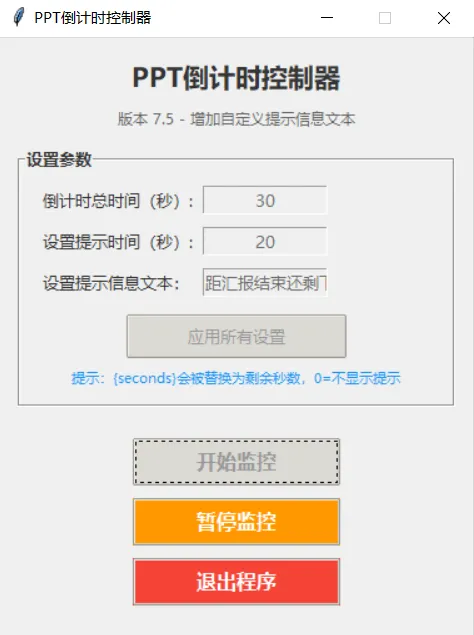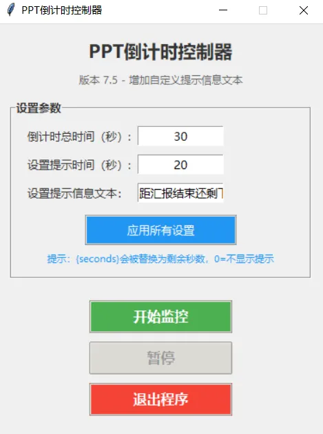import win32guiimport win32conimport win32apiimport timeimport threadingimport queueimport keyboardimport tkinter as tk# ---------- 右上角小窗口 ----------class CornerDisplay: def __init__(self, master): self.master = master self.window = None self.q = queue.Queue() master.after(100, self._process_queue) def _create(self): self.window = tk.Toplevel(self.master) sw = self.window.winfo_screenwidth() self.window.geometry(f"80x30+{sw-85}+5") self.window.attributes('-topmost', True, '-alpha', 0.9) self.window.overrideredirect(True) self.window.configure(bg='black') self.label = tk.Label(self.window, font=('Arial',14,'bold'), fg='white', bg='black') self.label.pack(expand=True, fill='both') self.window.withdraw() def _process_queue(self): try: while True: cmd = self.q.get_nowait() if cmd[0] == 'show': if not self.window: self._create() self.label.config(text=cmd[1], fg=cmd[2]) self.window.deiconify() elif cmd[0] == 'hide': if self.window: self.window.withdraw() elif cmd[0] == 'destroy': if self.window: self.window.destroy() return except queue.Empty: pass self.master.after(100, self._process_queue) def show(self, text, color): self.q.put(('show', text, color)) def hide(self): self.q.put(('hide',)) def destroy(self): self.q.put(('destroy',))# ---------- 中央大数字 ----------class CenterDisplay: def __init__(self, master): self.master = master self.window = None self.q = queue.Queue() master.after(100, self._process_queue) def _create(self): self.window = tk.Toplevel(self.master) sw, sh = self.window.winfo_screenwidth(), self.window.winfo_screenheight() self.window.geometry(f"300x300+{(sw-300)//2}+{(sh-300)//2}") self.window.attributes('-topmost', True) self.window.overrideredirect(True) self.window.configure(bg='white') self.window.wm_attributes('-transparentcolor', 'white') self.label = tk.Label(self.window, font=('Arial',200,'bold'), bg='white') self.label.pack(expand=True, fill='both') self.window.withdraw() def _process_queue(self): try: while True: cmd = self.q.get_nowait() if cmd[0] == 'show': if not self.window: self._create() self.label.config(text=cmd[1], fg=cmd[2]) self.window.deiconify() elif cmd[0] == 'hide': if self.window: self.window.withdraw() elif cmd[0] == 'destroy': if self.window: self.window.destroy() return except queue.Empty: pass self.master.after(100, self._process_queue) def show(self, num): colors = {10:'#FF9999',9:'#FF8888',8:'#FF7777',7:'#FF6666',6:'#FF5555', 5:'#FF4444',4:'#FF3333',3:'#FF2222',2:'#FF1111',1:'#FF0000',0:'#FF0000'} self.q.put(('show', str(num), colors.get(num,'#FF0000'))) def hide(self): self.q.put(('hide',)) def destroy(self): self.q.put(('destroy',))# ---------- 提示窗口 ----------class AlertDisplay: def __init__(self, master): self.master = master self.window = None self.q = queue.Queue() self.template = "距汇报结束还剩下{seconds}秒" master.after(100, self._process_queue) def _create(self): self.window = tk.Toplevel(self.master) sw = self.window.winfo_screenwidth() self.window.geometry(f"350x100+{sw-355}+40") self.window.attributes('-topmost', True, '-alpha', 0.85) self.window.overrideredirect(True) self.window.configure(bg='black') self.label = tk.Label(self.window, font=('Microsoft YaHei',16,'bold'), fg='#FFD700', bg='black', wraplength=320) self.label.pack(expand=True, fill='both', padx=10, pady=10) self.window.withdraw() self.timer = None def _process_queue(self): try: while True: cmd = self.q.get_nowait() if cmd[0] == 'show': if not self.window: self._create() self.label.config(text=cmd[1]) self.window.deiconify() if self.timer: self.window.after_cancel(self.timer) self.timer = self.window.after(3000, self.hide) elif cmd[0] == 'hide': if self.window: self.window.withdraw() elif cmd[0] == 'destroy': if self.window: if self.timer: self.window.after_cancel(self.timer) self.window.destroy() return except queue.Empty: pass self.master.after(100, self._process_queue) def show(self, seconds): text = self.template.replace("{seconds}", str(seconds)) self.q.put(('show', text)) def hide(self): self.q.put(('hide',)) def destroy(self): self.q.put(('destroy',)) def set_template(self, template): self.template = template# ---------- 监控核心 ----------class PPTMonitor: def __init__(self, master): self.master = master self.corner = CornerDisplay(master) self.center = CenterDisplay(master) self.alert = AlertDisplay(master) self.total = 30 self.alert_time = 20 self.alert_text = "距汇报结束还剩下{seconds}秒" self.running = False self.paused = False self.stop_event = threading.Event() self.pause_event = threading.Event() self.pause_event.set() self.thread = None def set_params(self, total, alert_time, alert_text): self.total = max(1, min(total, 3600)) self.alert_time = max(0, min(alert_time, 3600)) self.alert.set_template(alert_text) def find_ppt(self): def cb(hwnd, lst): if win32gui.IsWindowVisible(hwnd): title = win32gui.GetWindowText(hwnd).lower() if any(k in title for k in ['powerpoint','幻灯片','.ppt','.pptx','ppt -']): lst.append(hwnd) return True lst = [] win32gui.EnumWindows(cb, lst) return lst[0] if lst else None def is_fullscreen(self, hwnd): try: l,t,r,b = win32gui.GetWindowRect(hwnd) sw = win32api.GetSystemMetrics(win32con.SM_CXSCREEN) sh = win32api.GetSystemMetrics(win32con.SM_CYSCREEN) return (l<=2 and t<=2 and r>=sw-2 and b>=sh-2) except: return False def countdown_loop(self): self.corner.show(self._fmt(self.total), self._color(self.total)) self.alert_shown = False for i in range(self.total, 0, -1): if self.stop_event.is_set() or not self.running: break if self.paused: self.corner.hide() self.center.hide() self.alert.hide() self.pause_event.clear() while self.paused and self.running and not self.stop_event.is_set(): self.pause_event.wait(0.2) if not self.paused: self.pause_event.set() self.corner.show(self._fmt(i), self._color(i)) if i<=10: self.center.show(i) self.corner.show(self._fmt(i), self._color(i)) if i==self.alert_time and not self.alert_shown and self.alert_time>0: self.alert.show(i) self.alert_show