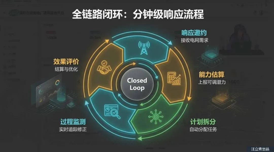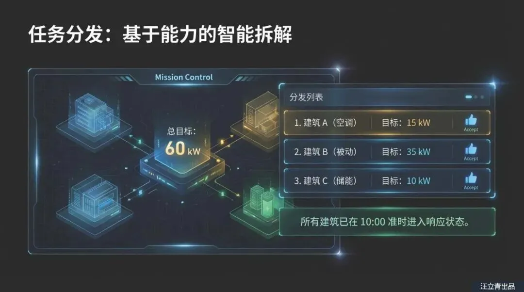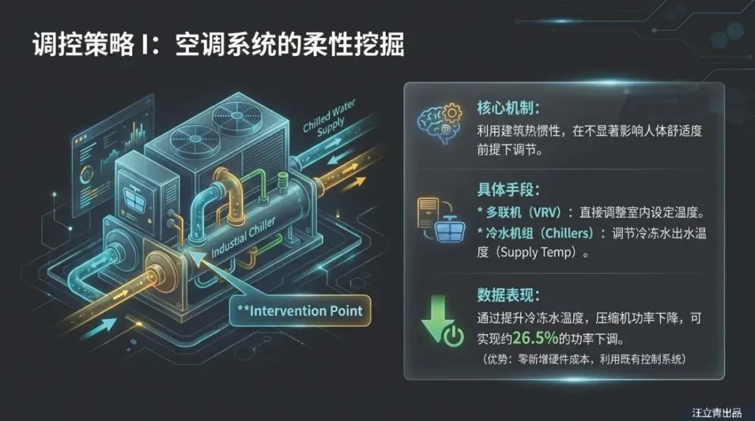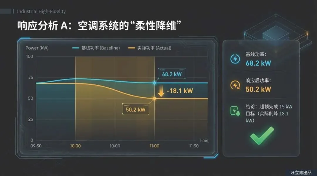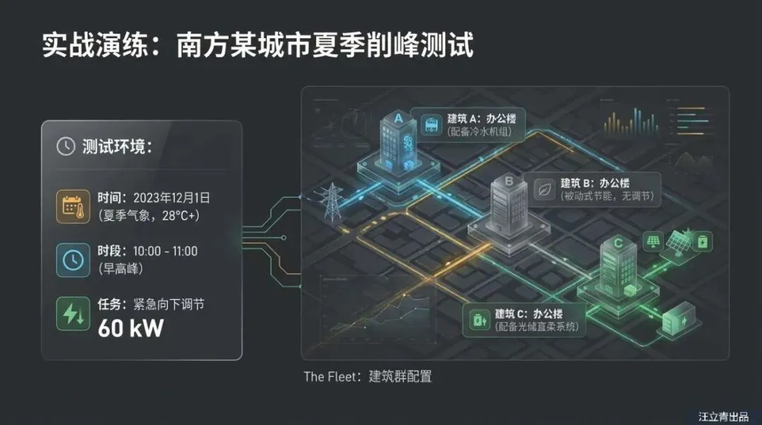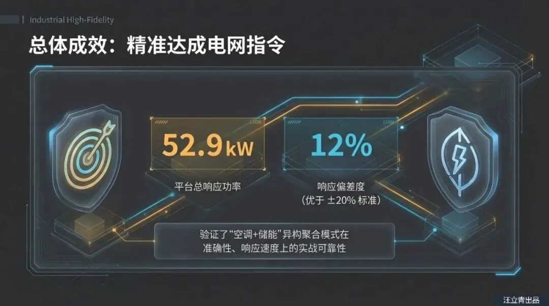 这不仅是概念构想,更是一场经过验证的技术实战!报告详细复盘了某南方城市3栋典型办公建筑的聚合测试:通过自主研发的VPP聚合平台,实现了从响应能力估算、计划拆解到过程监测与效果评价的全链路闭环。实测数据显示,通过精准调节中央空调冷冻水温度(下调功率达26.5%)与建筑储能的配合,这三栋建筑成功提供了总量52.9 kW的柔性响应能力,**响应精度高达12%**。这套系统展现了极高的技术成熟度:既能利用空调系统的热惯性“无感”调节,又能发挥电化学储能的“秒级”响应优势,完美解决了海量异构设备难以协同的行业痛点。