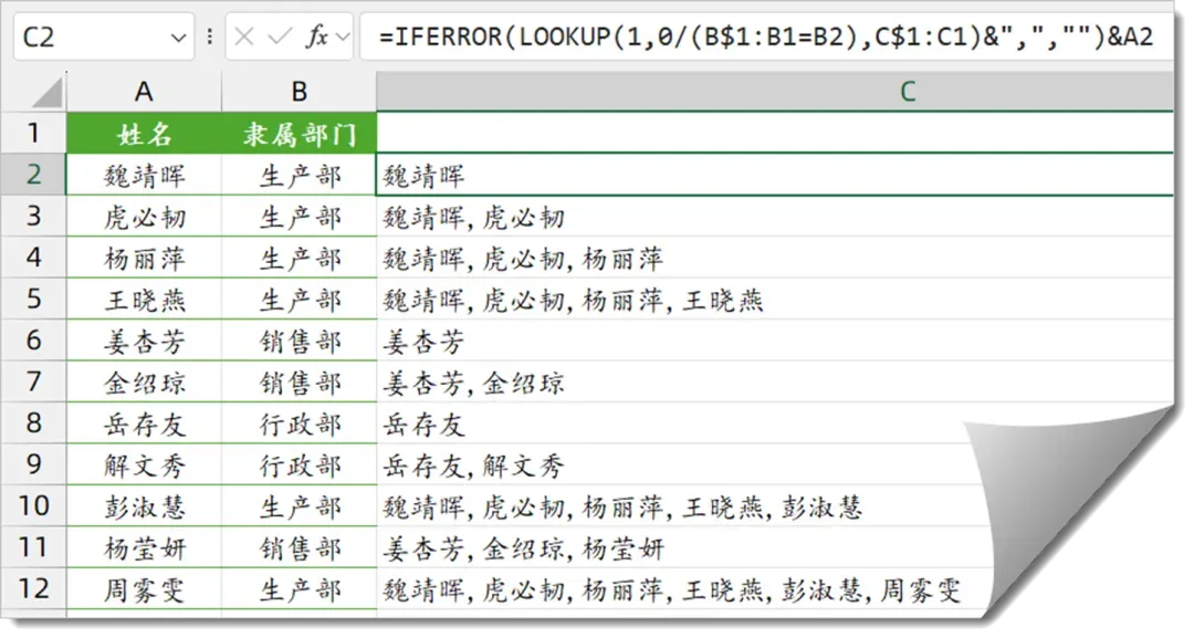 =IFERROR(LOOKUP(1,0/(B$1:B1=B2),C$1:C1)&",","")&A2