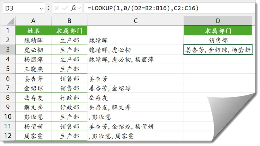 再从D3单元格输入以下公式,得到所有人员姓名:
