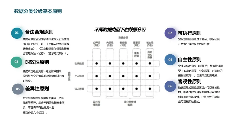 2. 科学定级:遵循合法、可落地、有时效性原则,将数据划分为公开、内部、敏感、核心、机密五个等级。