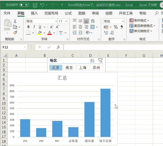 Step 05再对图表和切片器进行简单的调整即可,现在只要点切片器上面的地区,就可以获取每个地区的动态图表。
