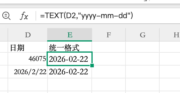 将任意日期转换为标准的 2026-02-22 格式,便于后续筛选和排序。