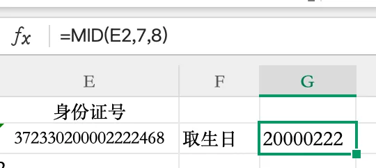 =MID(E2, 7, 8) // 从第 7 位开始提取 8 个字符(出生年月)