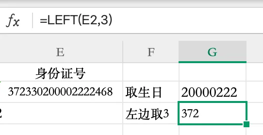 =LEFT(E2, 3) // 提取左侧 3 个字符