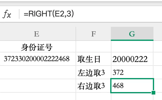 =RIGHT(E2, 2) // 提取右侧 3 个字符