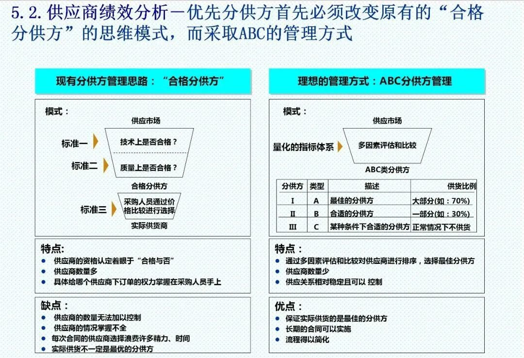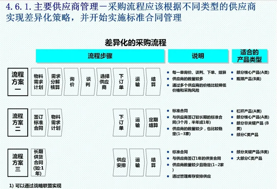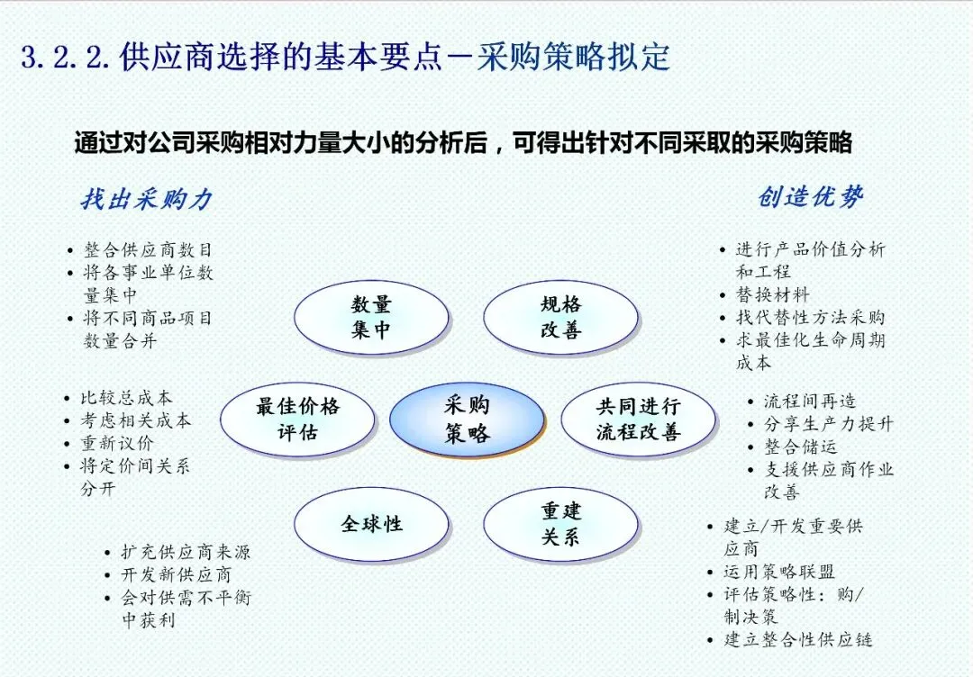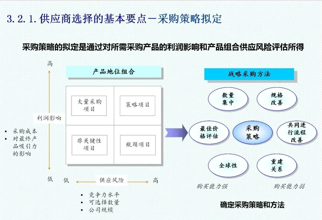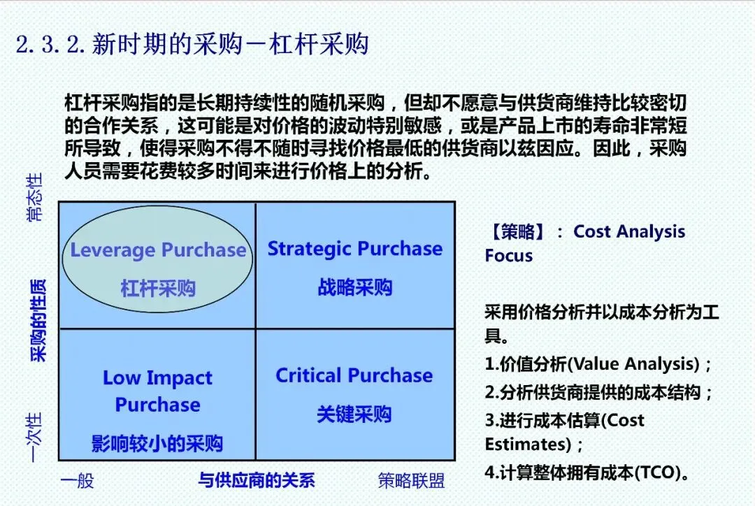 采购管理已超越简单的“购买”行为,成为企业供应链的主导力量。新时期采购呈现出差异化策略:对于杠杆采购,需采用成本分析工具,计算整体拥有成本;对于关键采购,应以生命周期成本为核心评估标准;而对于战略性采购,则需要与供应商建立开放账簿的成本共享机制,实施持续成本改善。