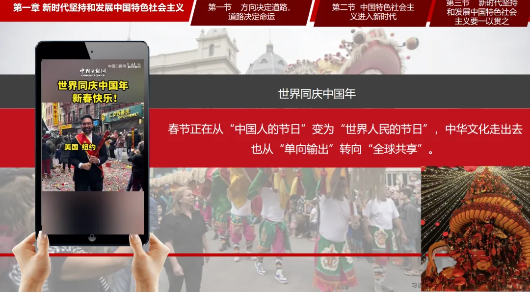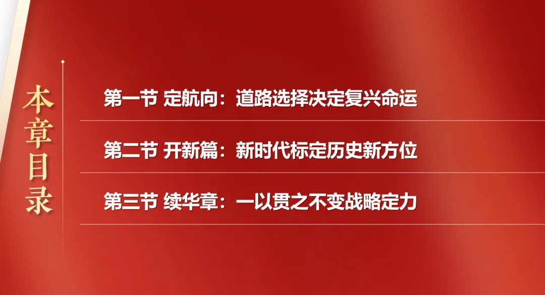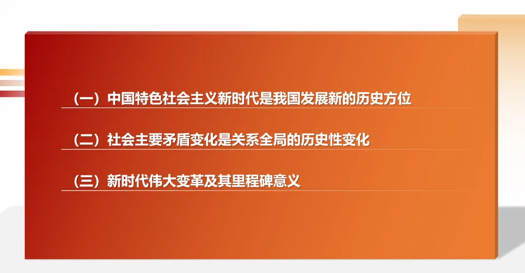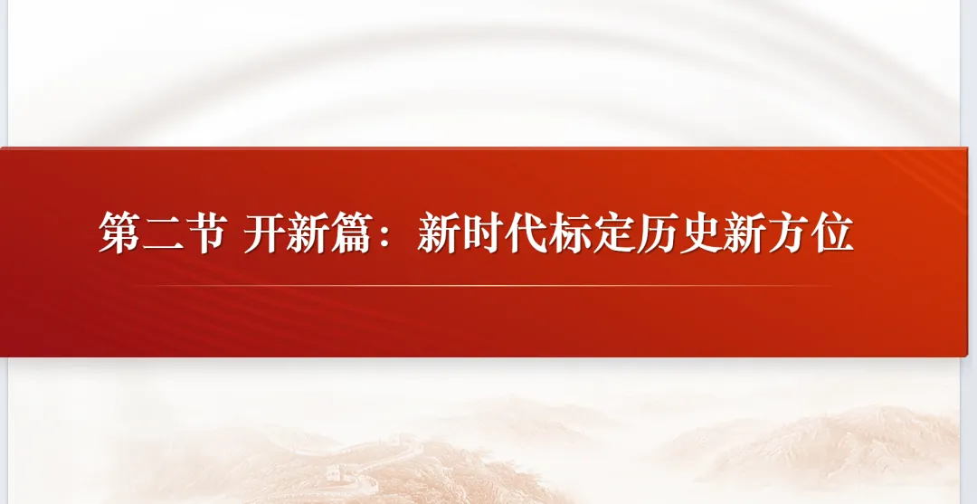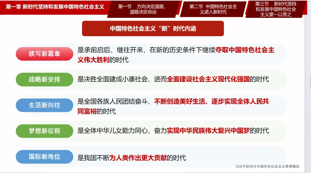 P42首先,新时代的科学内涵发生了变化。从续写新篇章来看,新时代是承前启后、继往开来、在新的历史条件下继续夺取中国特色社会主义伟大胜利的时代。纵观新中国发展史,1949年新中国成立,意味中国人民站立起来;随后通过社会主义革命、社会主义建设以及改革开放,我们看见了一个日益富裕的中国;直到进入新时代,今日的中国逐渐强大。从战略新安排来看,新时代是决胜全面建成小康社会进而全面建设社会主义现代化强国的时代。