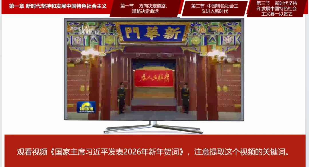 P41观看视频《国家主席习近平发表2026年新年贺词》,注意提取这个视频的关键词。我们请同学们来回答这个视频讲述了中国在2025年取得得哪些成就?听完同学们的回答其实我们可以感受到2025年我们在经济领域、科技领域、民生领域、社会保障方面取得的一系列成就。通过这些成就其实我们可以感受到我们身处在一个崭新的时代,这是我们新的历史方位,但是同学们有没有想过这个崭新的时代到底“新”在哪里了?
